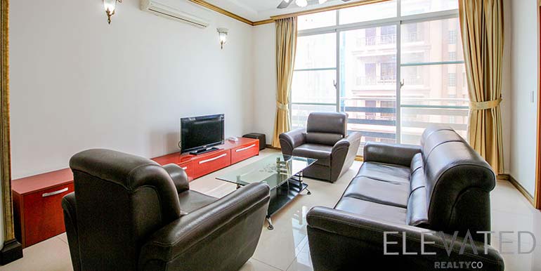 This condominium is located in Beong Keng Kang I neighborhood has 1 bedroom, 1 bathroom, a flat screen TV, natural light, furnishings, and built-in closet. The unit is equipped with a washing machine in unit. Building amenities include internet, cable, security, cleaning 3 times per week, fitness center, swimming pool, garbage collection, generator, propane, car, motorbike, and bicycle parking.