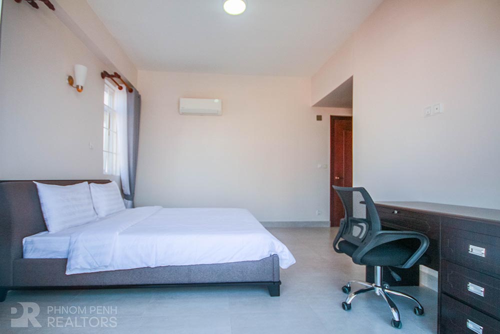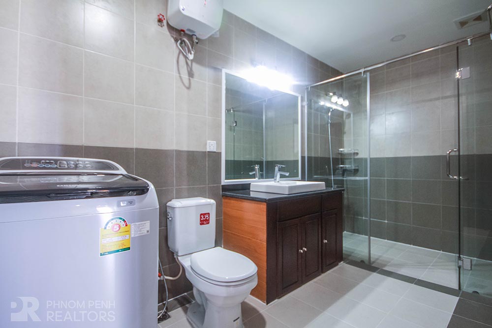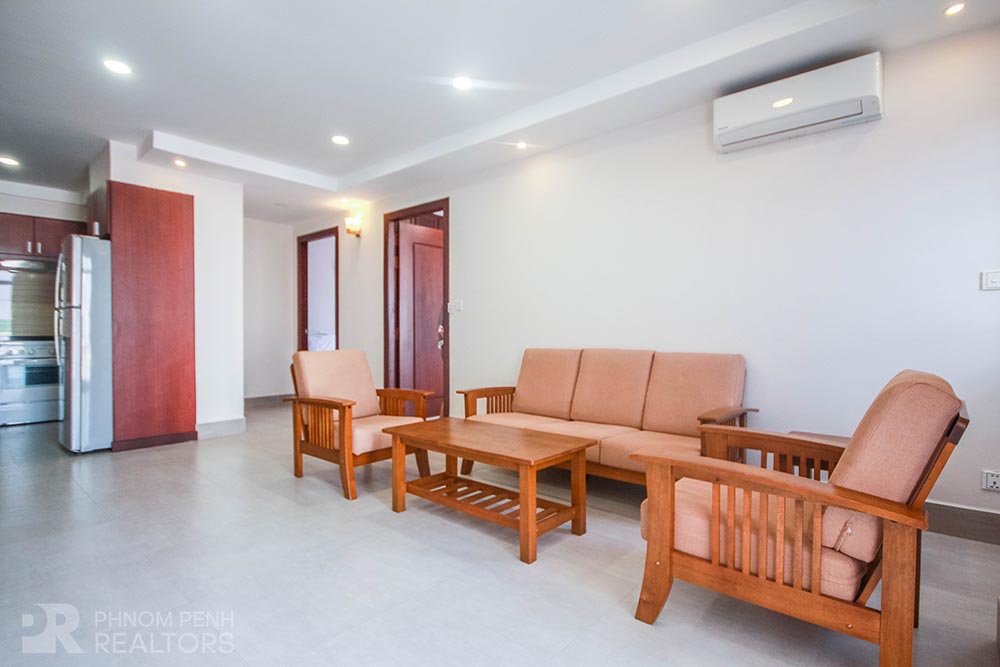 This apartment with natural light is located in Boeng Keng Kang II area has 2 bedrooms, 2 bathrooms, 2 balconies. This furnished unit is equipped with air-cons, refrigerator, hot water, flat screen TVs, closets and washing machine. This unit included with internet and cable Tv. Building amenities include security, elevators, fitness center, parking space for car, motorcycle and bicycle.