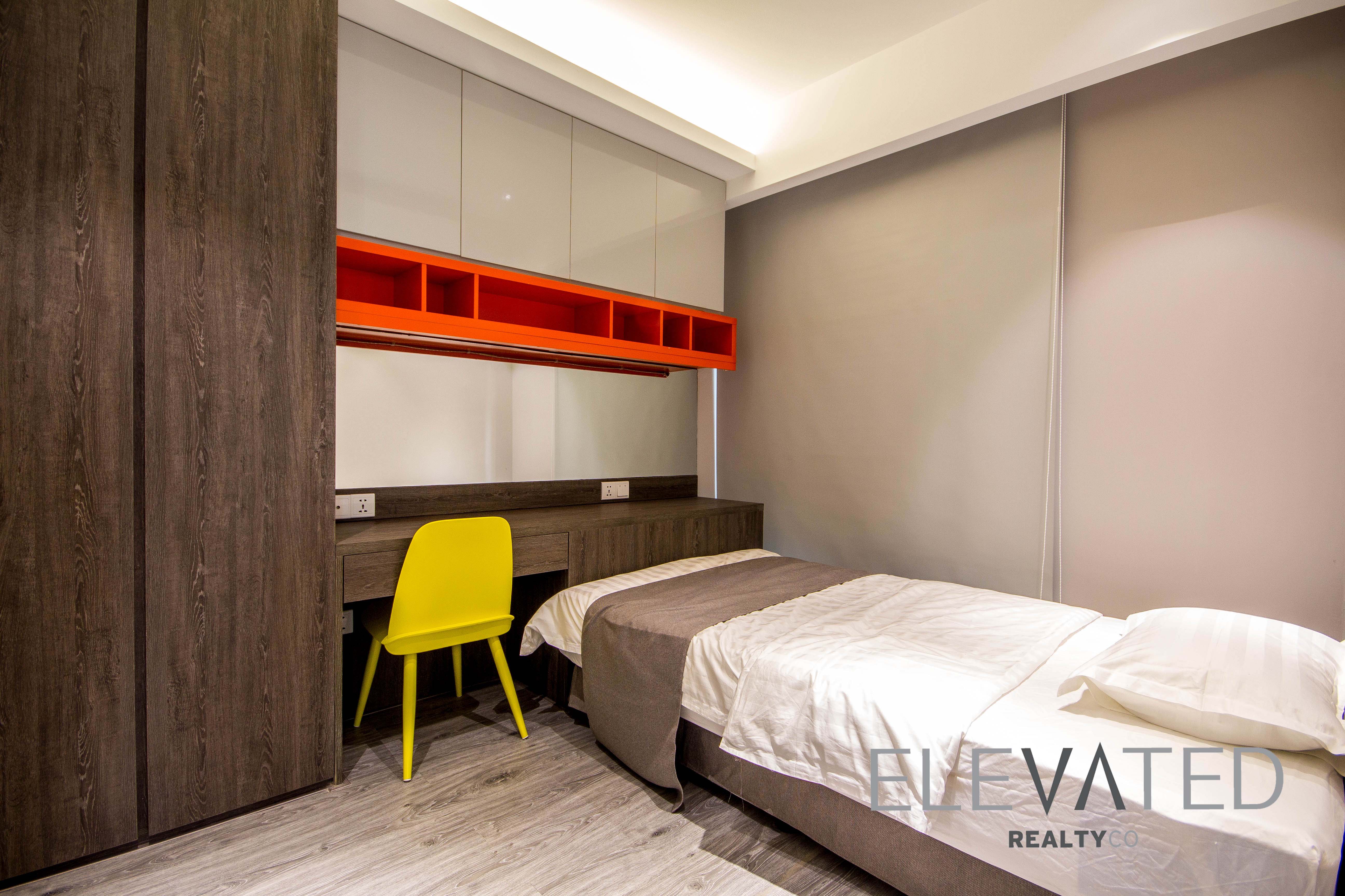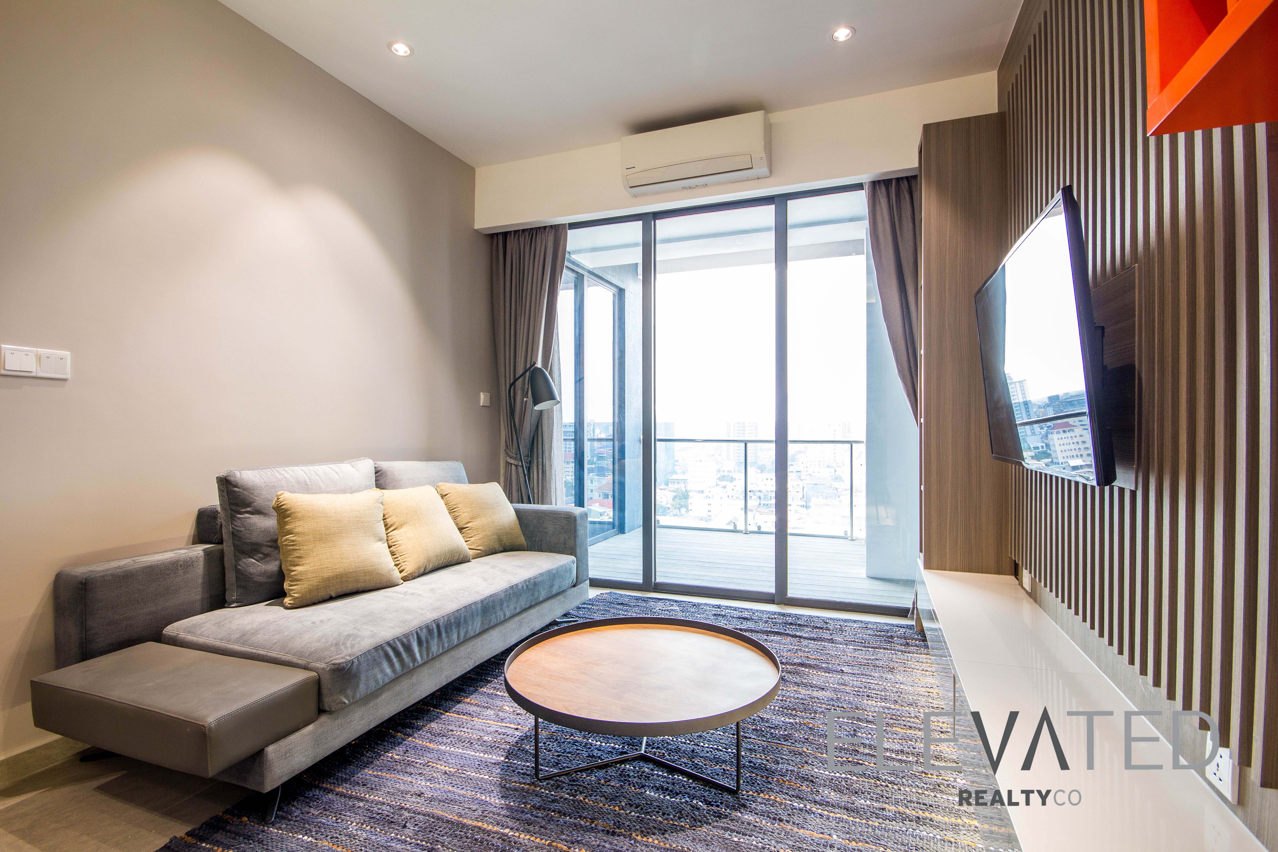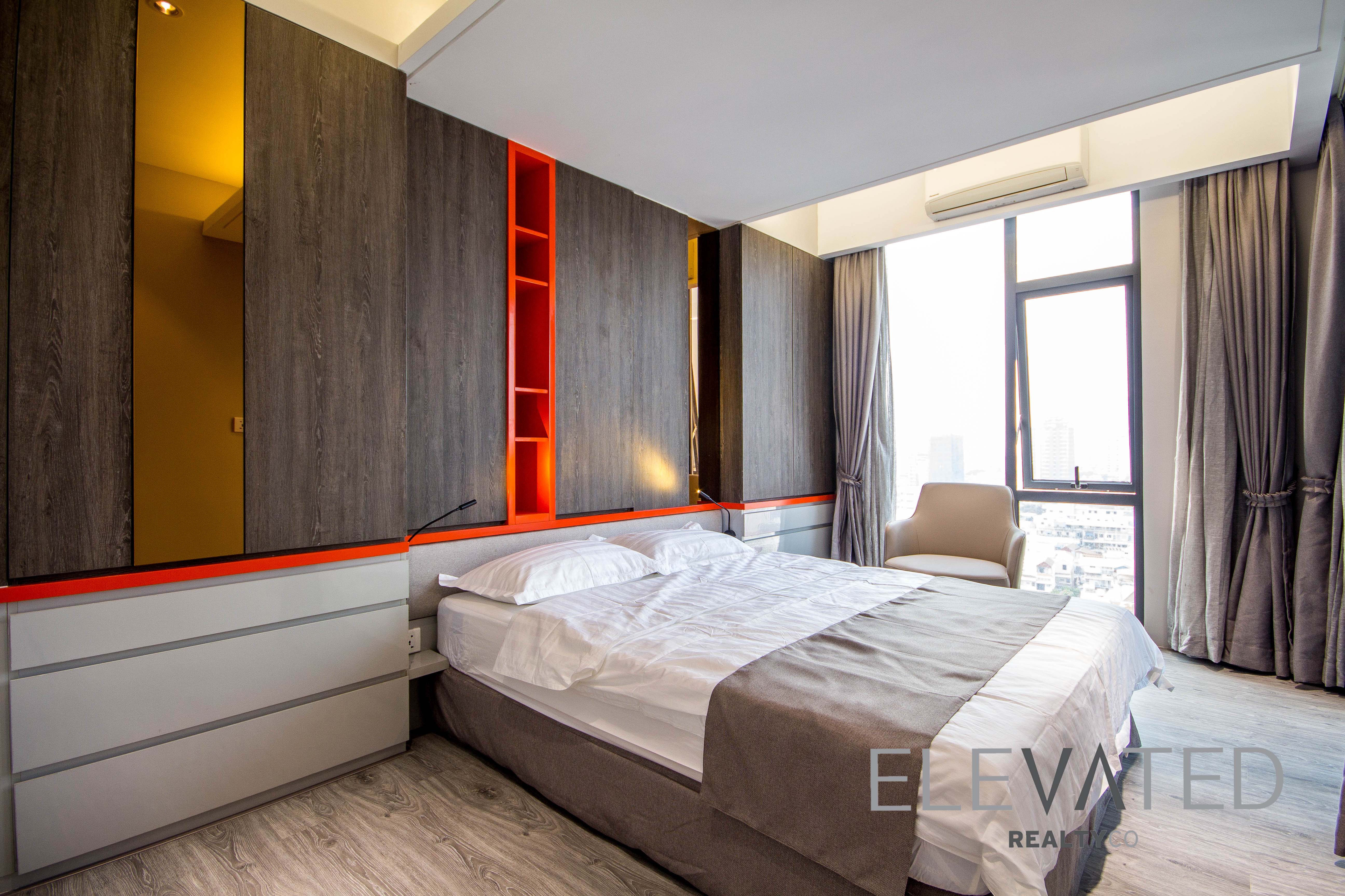 This condominium is located in BKK1 area has 2 bedrooms, 1 bathroom and a lot of natural light. This furnished unit is equipped with a flat screen TV, air-con, hot water, washing machine, built-in closets and a balcony. The unit services included internet, cable TV and cleaning twice a week. Building amenities include reception, fitness center, swimming pool, parking space for car($50), motorbike and bicycle.