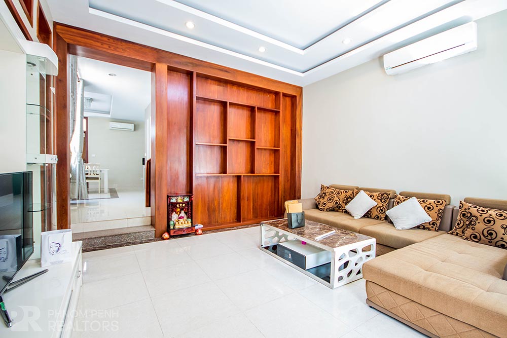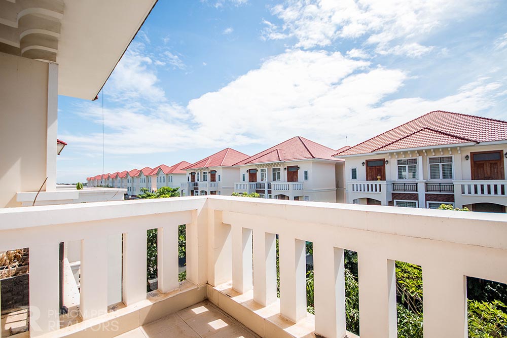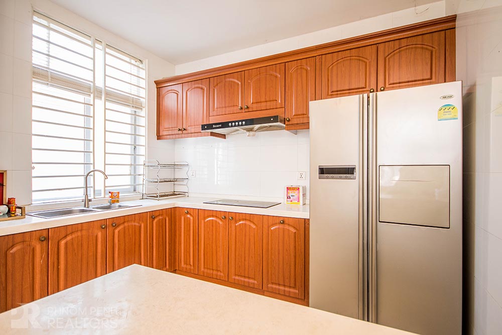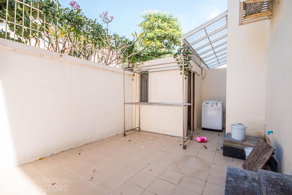 This villa is located in Chroy Changva area has 4 bedrooms, 6 bathrooms, 2 kitchens and a lot of natural light. This furnished villa is equipped with air-cons, hot water, flat screen TVs, washing machine, refrigerator, balconies and terraces. The villa services included internet and cable TV. Villa amenities include security, cleaning in public area, parking for car, motorbike and bicycle.