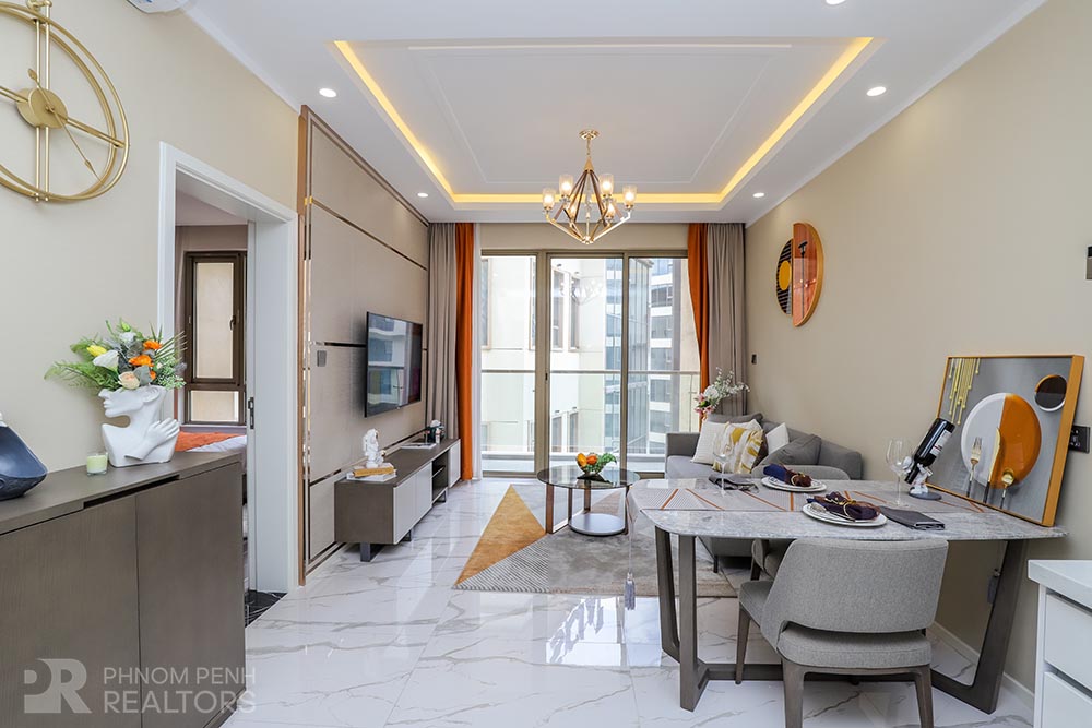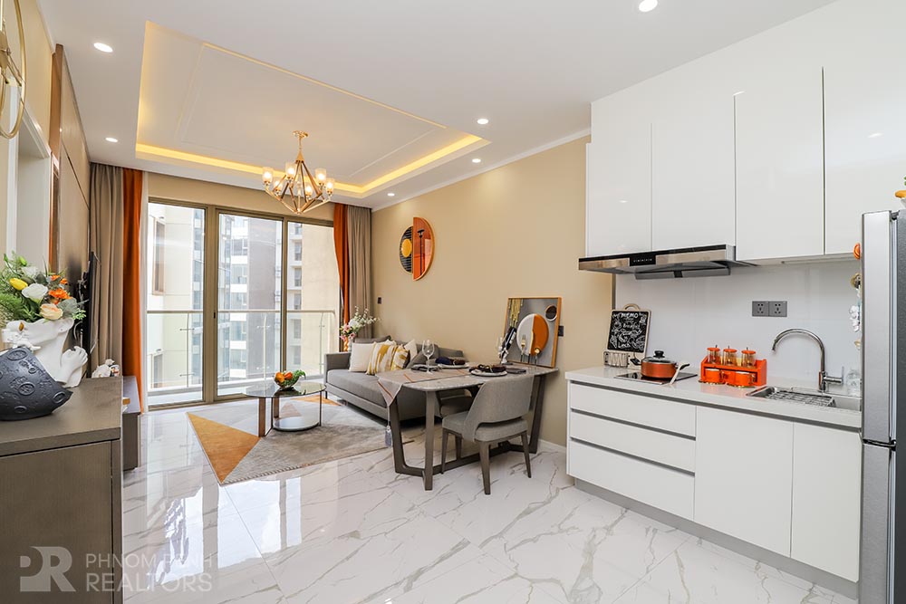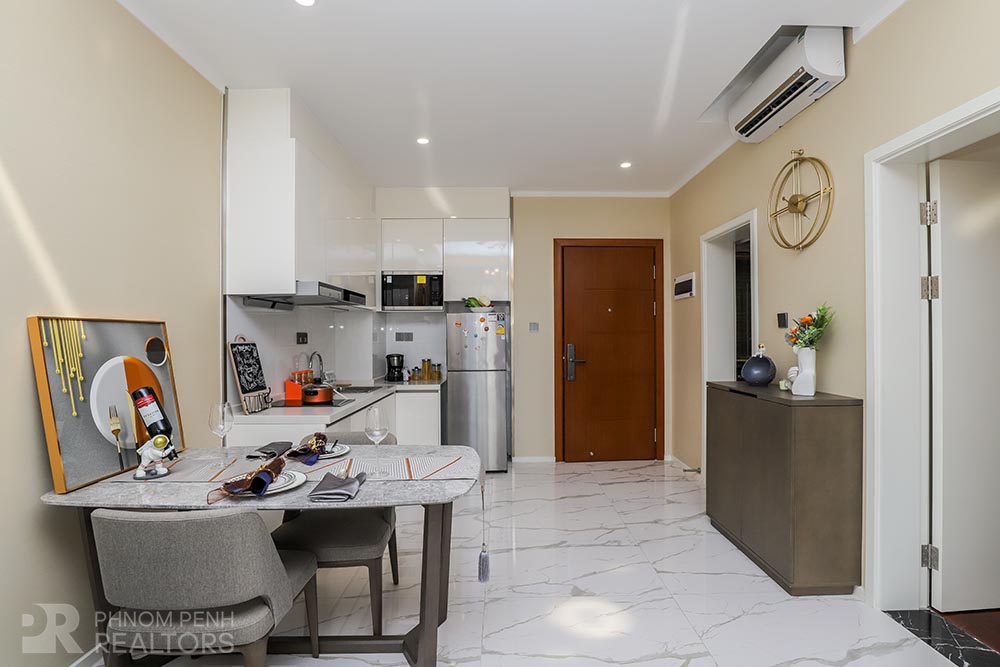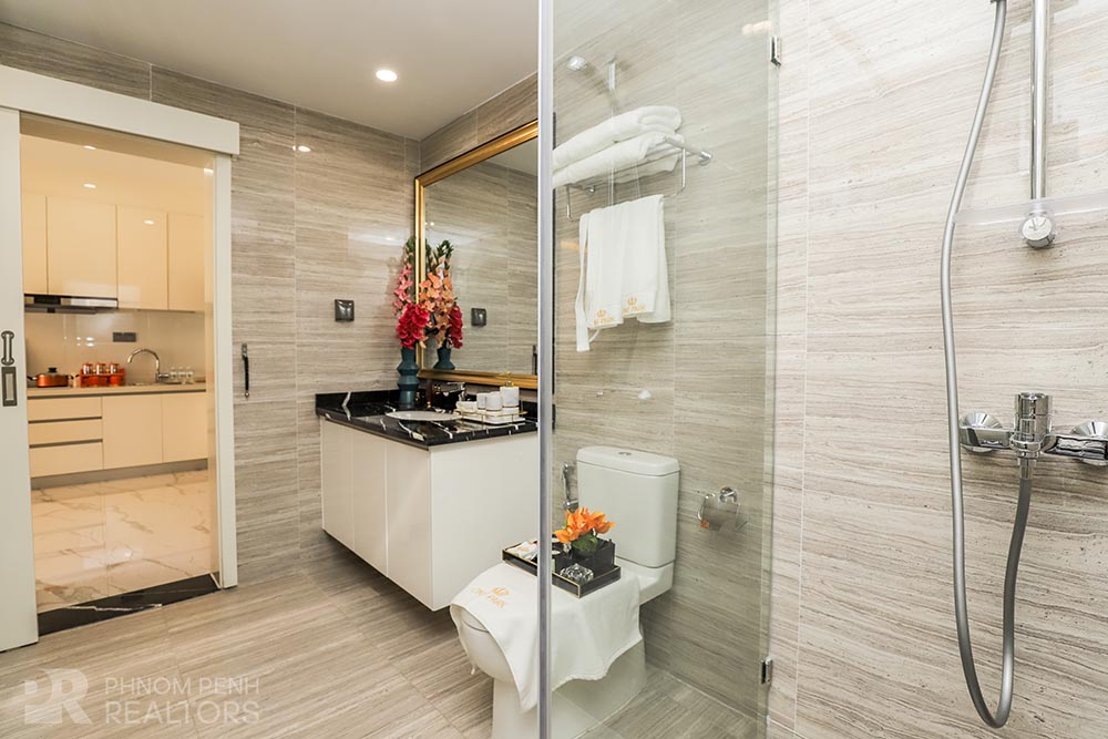 This modern style condo is located in Daun Penh neighborhood has 1 bedroom, 1 bathrooms, built in closet, a flat screen TV, natural light and modern furnishings. The unit is equipped with a microwave, in unit washing machine and a balcony. Building amenities include internet, cable TV, cleaning 1 times a week, garbage collection and propane, Parking for a car, motorbike, and bicycle.