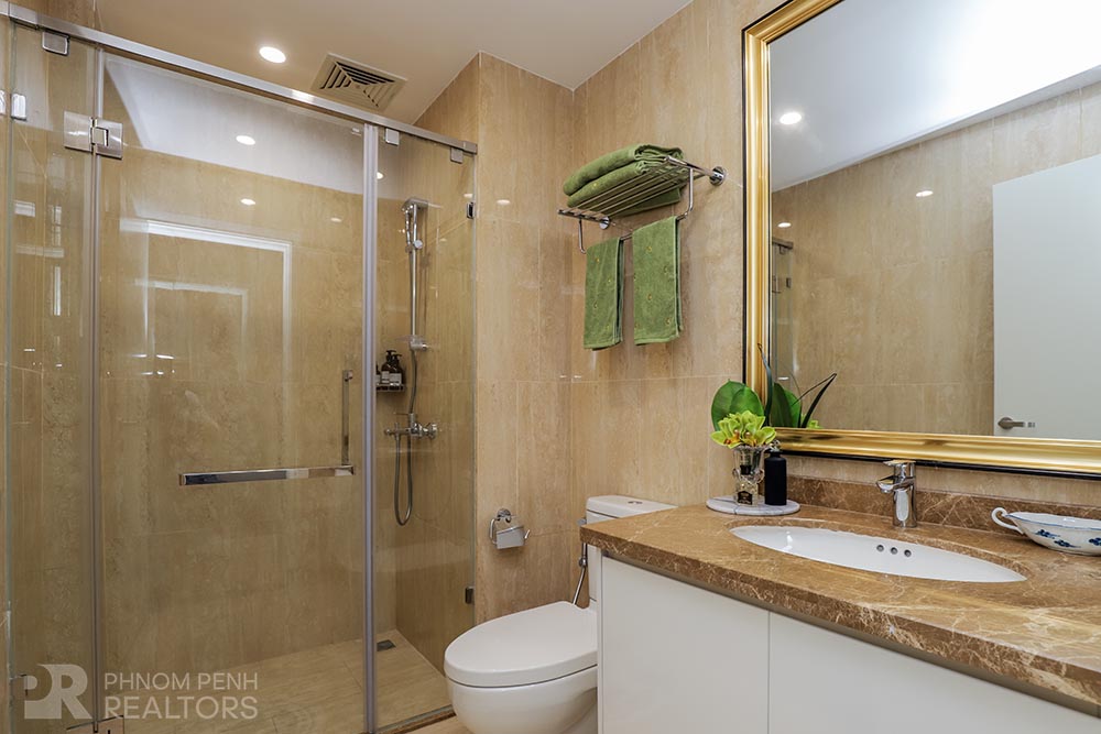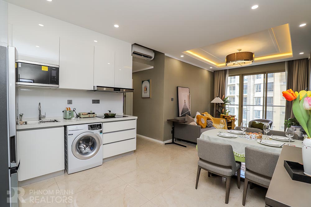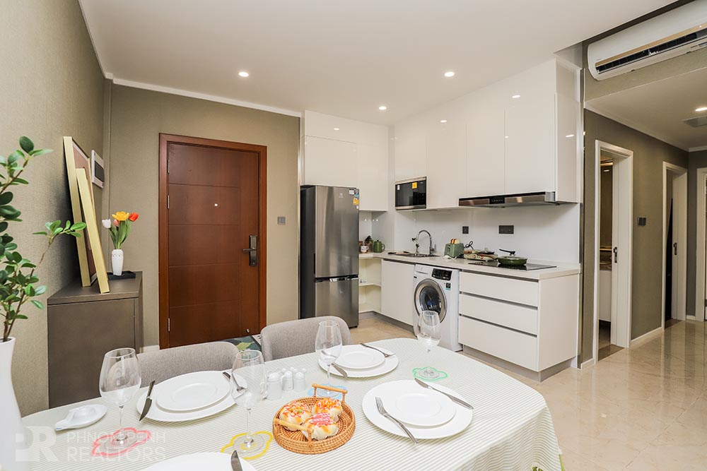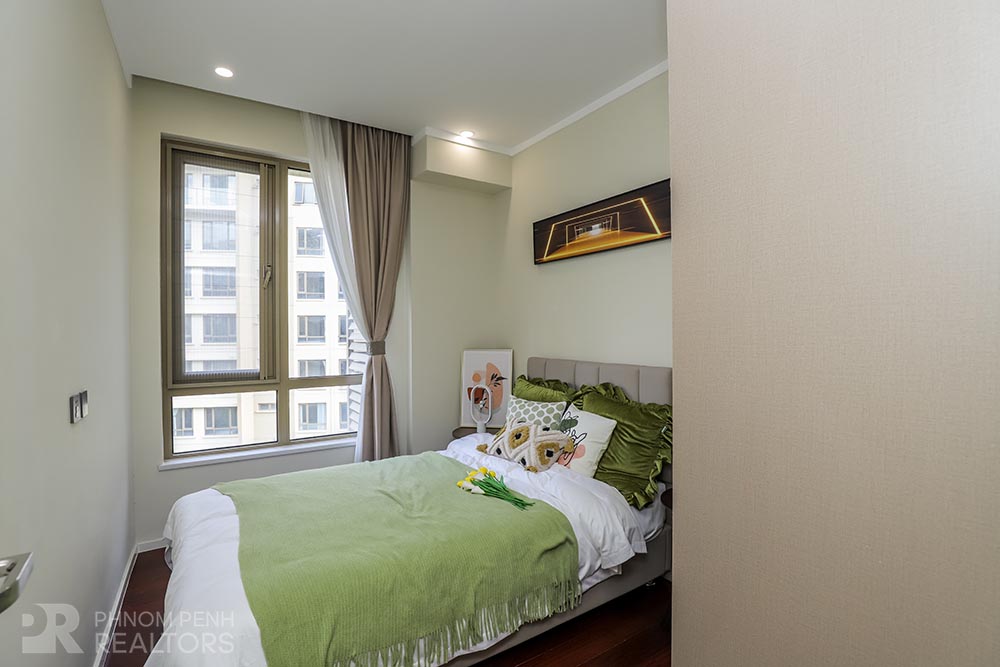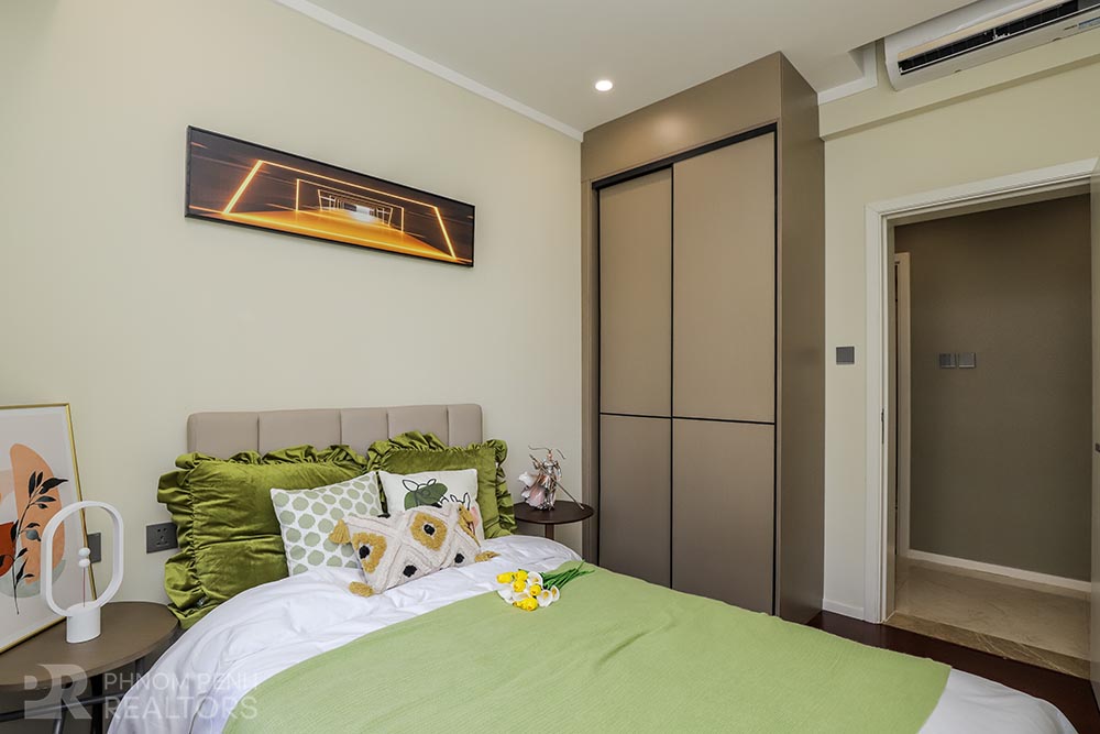 This modern style condominium is located in Daun Penh neighborhood has 2 bedrooms, 2 bathrooms, built in closet, a flat screen TV, natural light and modern furnishings. The unit is equipped with a microwave, in unit washing machine and a balcony. Building amenities include internet, cable TV, cleaning 1 time a week, garbage collection and propane, Parking for a car, motorbike, and bicycle.