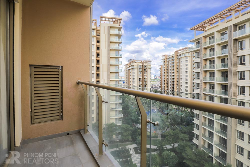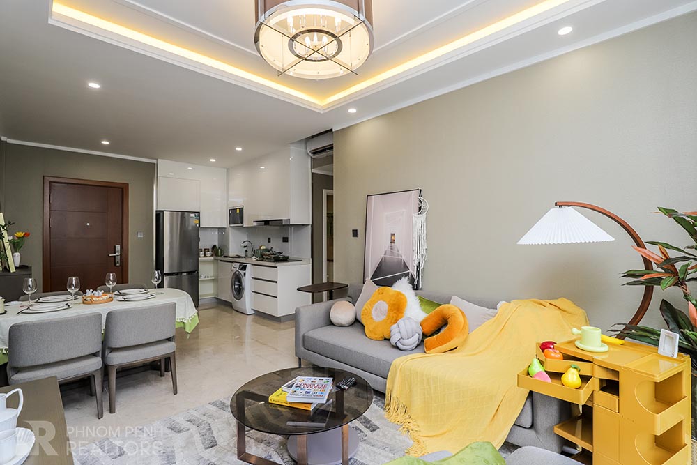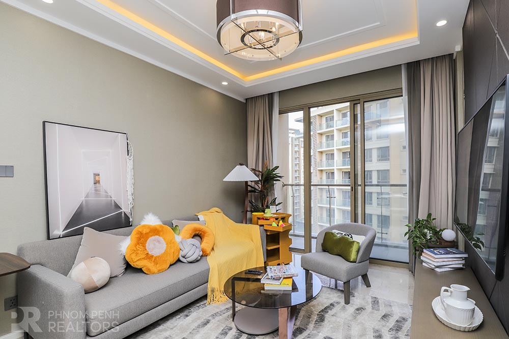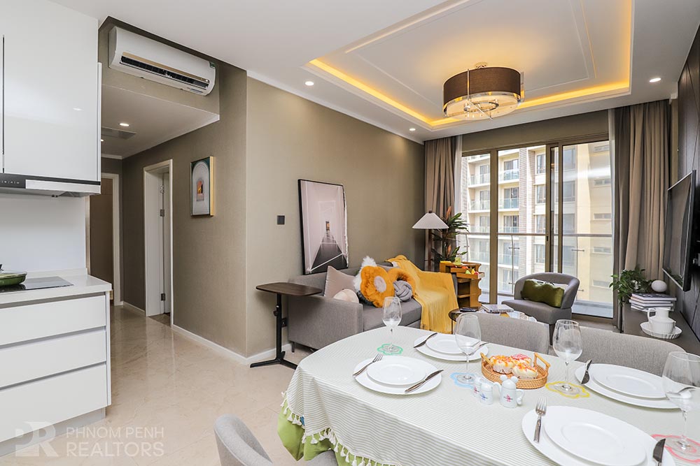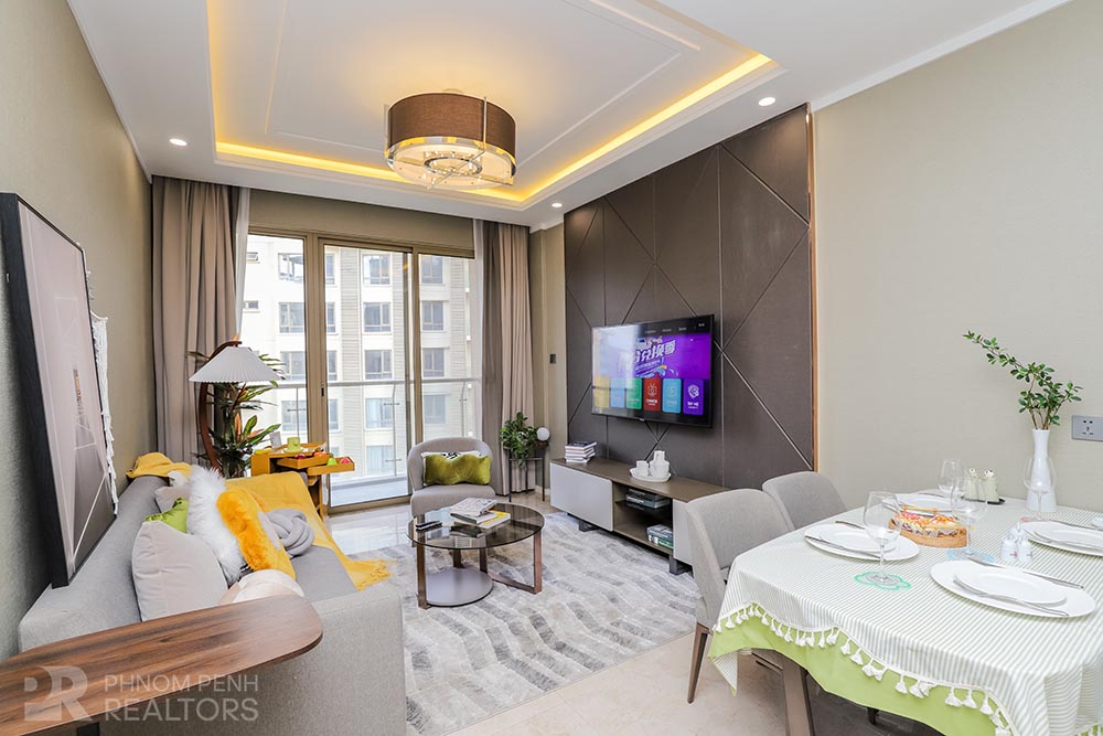 This modern style condominium is located in Daun Penh neighborhood has 2 bedrooms, 2 bathrooms, built in closet, a flat screen TV, natural light and modern furnishings. The unit is equipped with a microwave, in unit washing machine and a balcony. Building amenities include internet, cable TV, cleaning 1 time a week, garbage collection and propane, Parking for a car, motorbike, and bicycle.