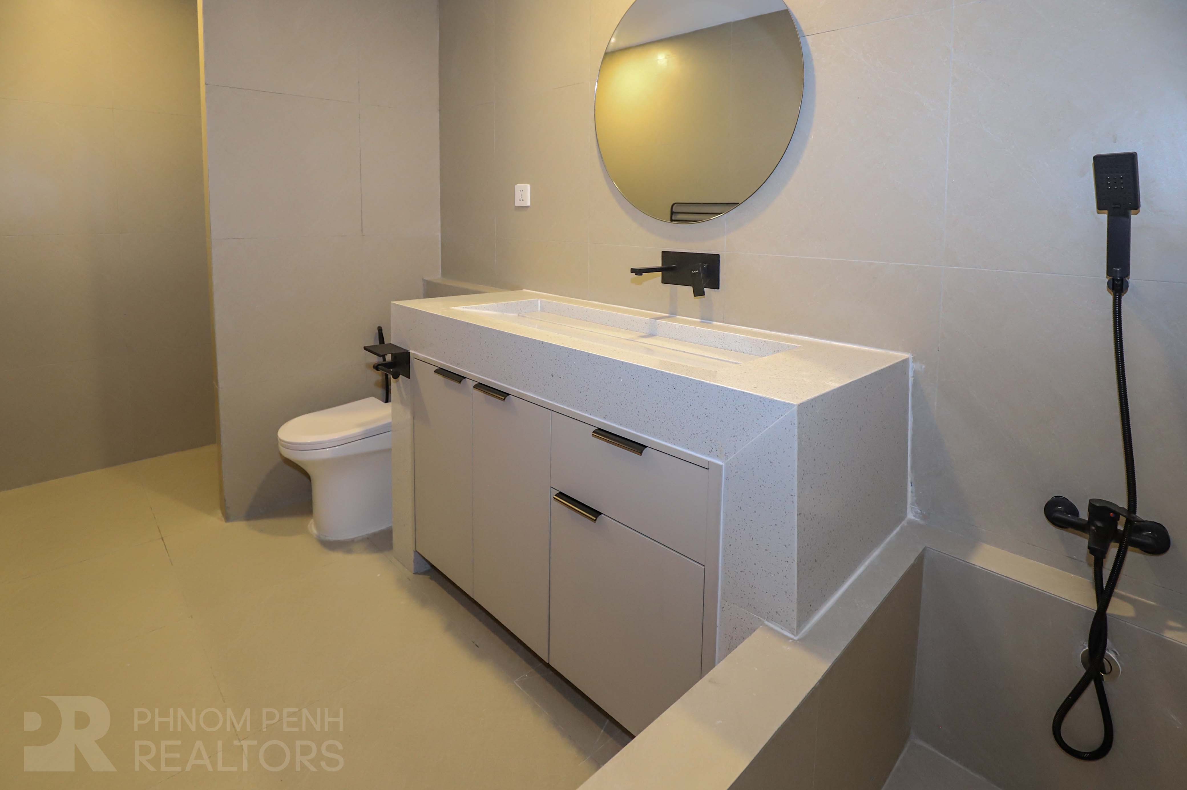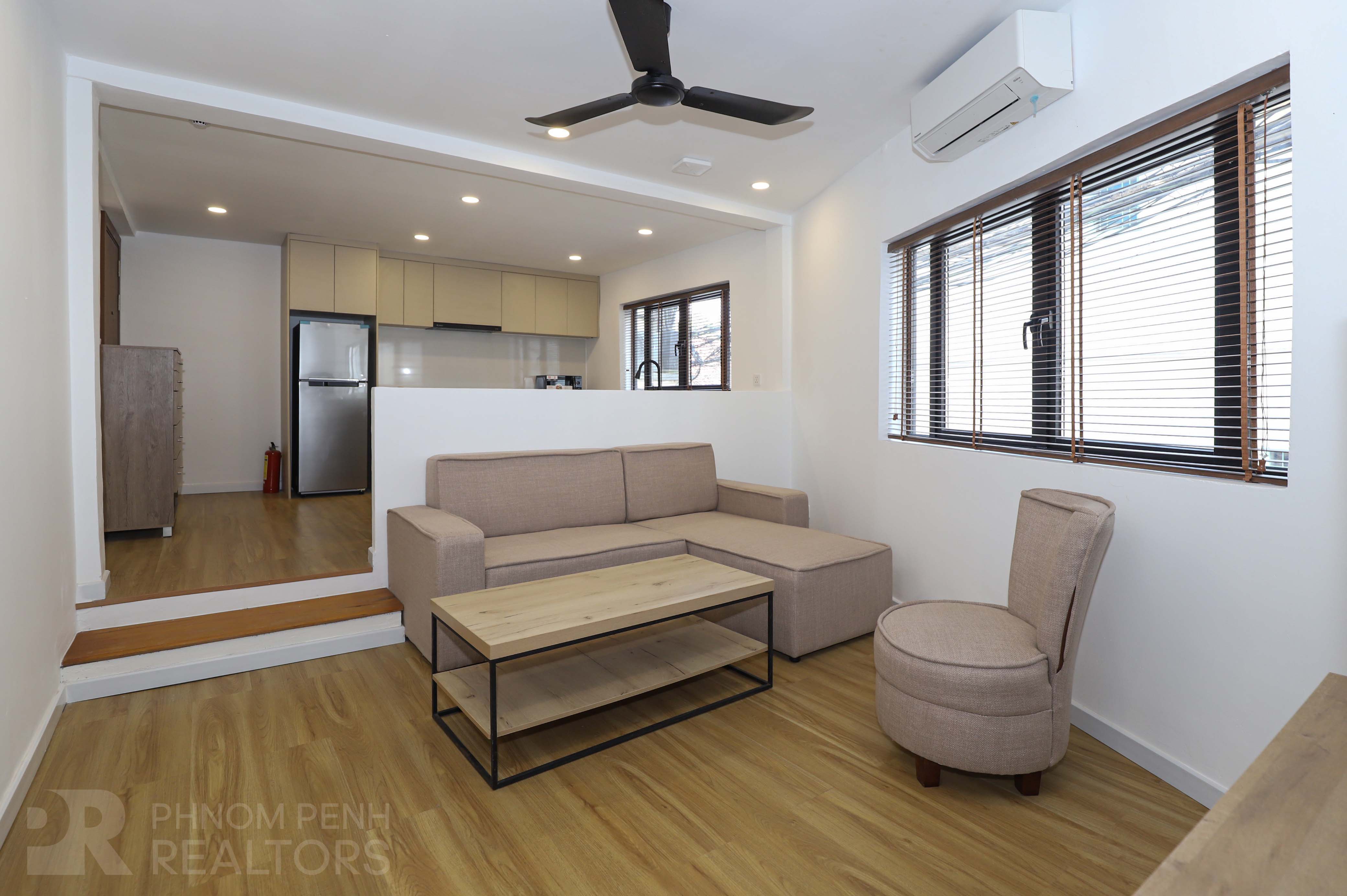 This newly Renovated is located in Sangkat Chaktumuk area near Royal Palace. It has 1 bedroom, 1 bathroom, built in closet, flat screen TV, fans, natural light and furnished. The unit is equipped with a oven, refrigerator, stove and a washing machine. Building amenities include internet, cable, garbage collection, propane and parking (motorbike and bicycle).