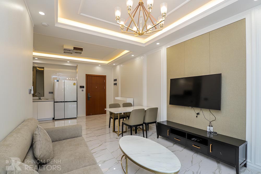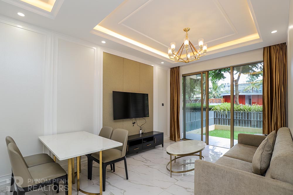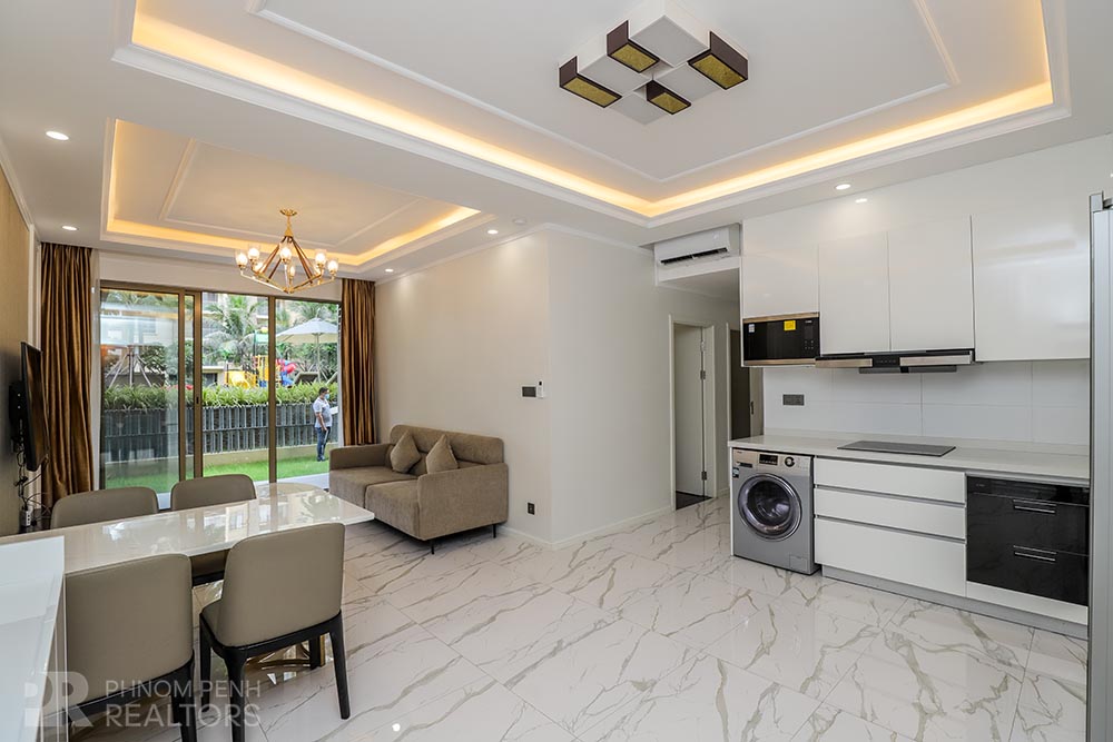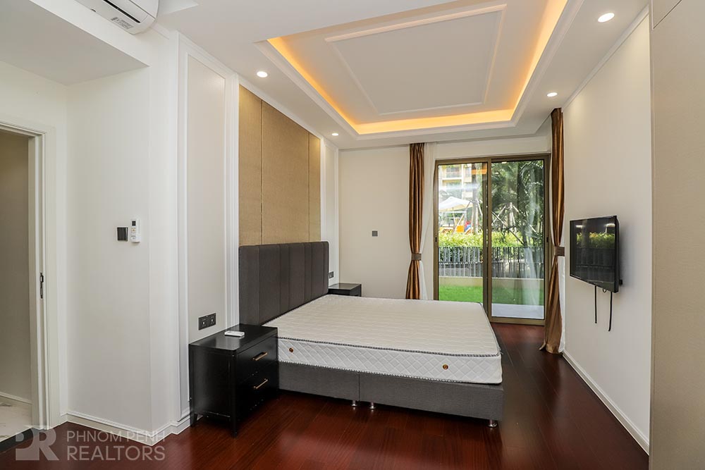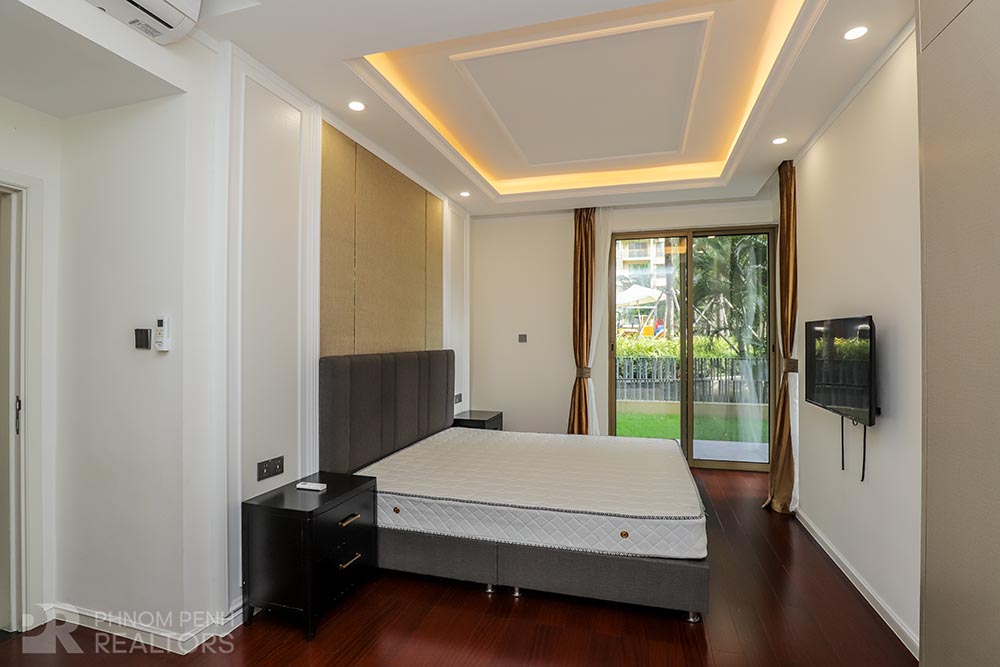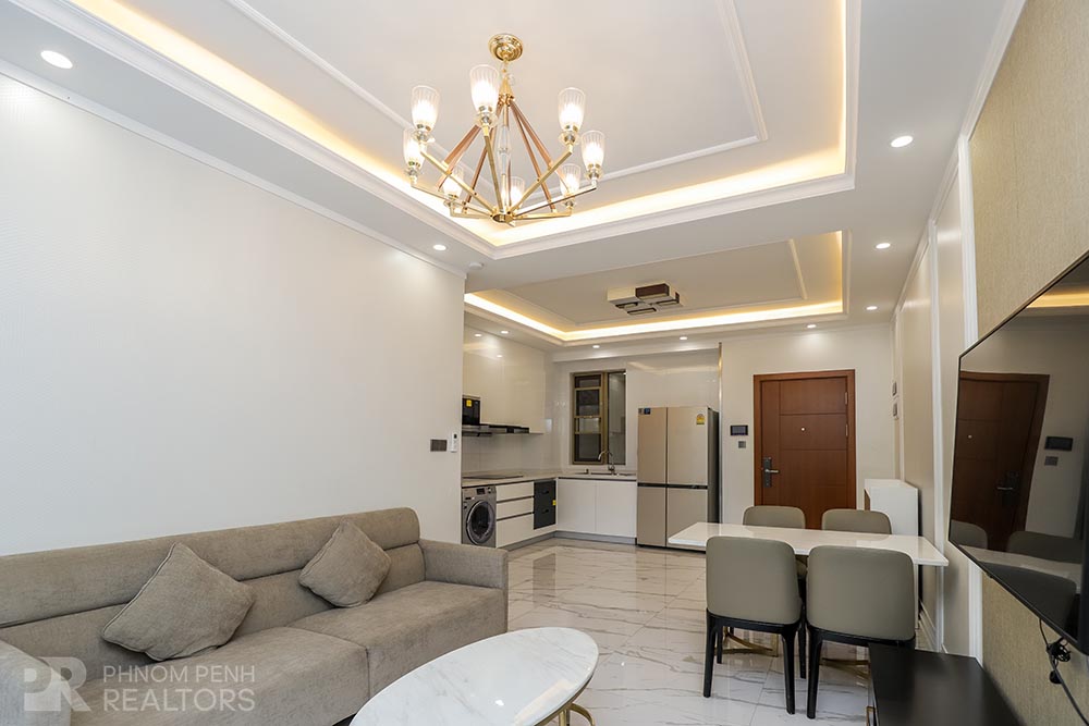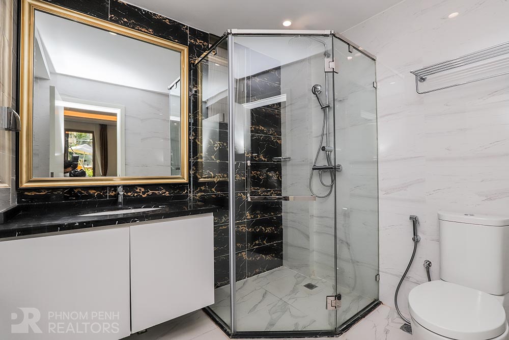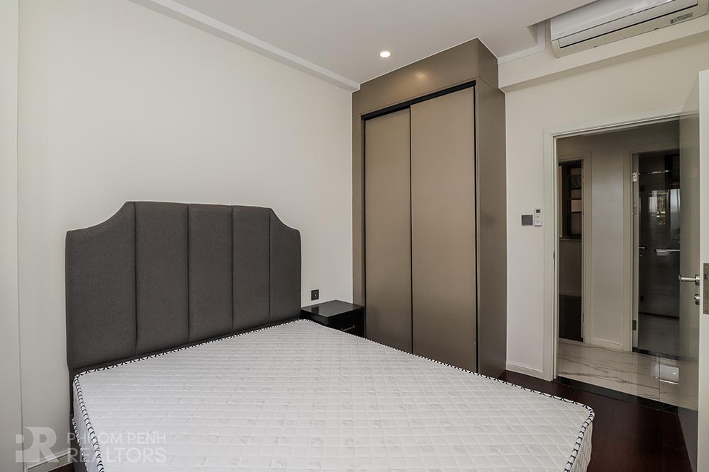 This modern style condo is located in Daun Penh neighborhood has 3 bedrooms plus with study room, 2 bathrooms, built in closet, a flat screen TV, natural light and modern furnishings. The unit is equipped with a microwave, in unit washing machine and a balcony. Building amenities include internet, cable TV, cleaning 1 times a week, garbage collection and propane, Parking for a car, motorbike, and bicycle.