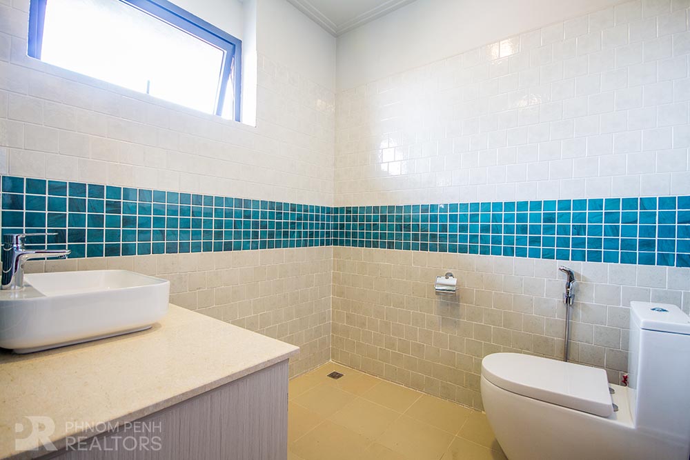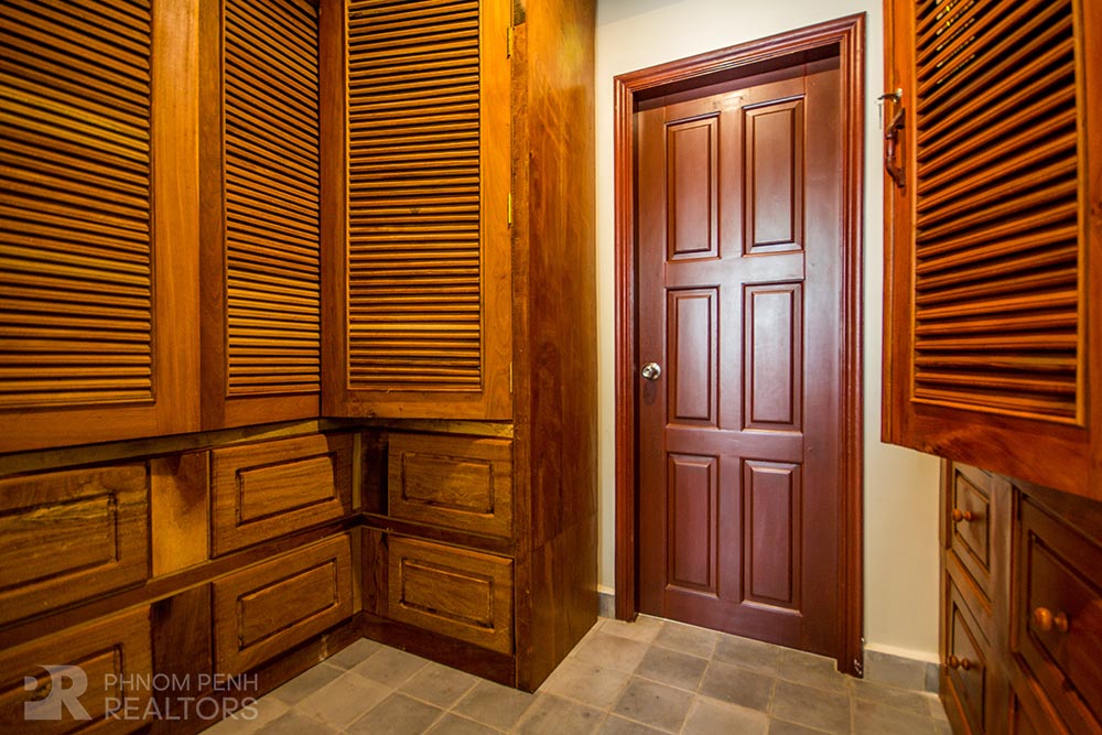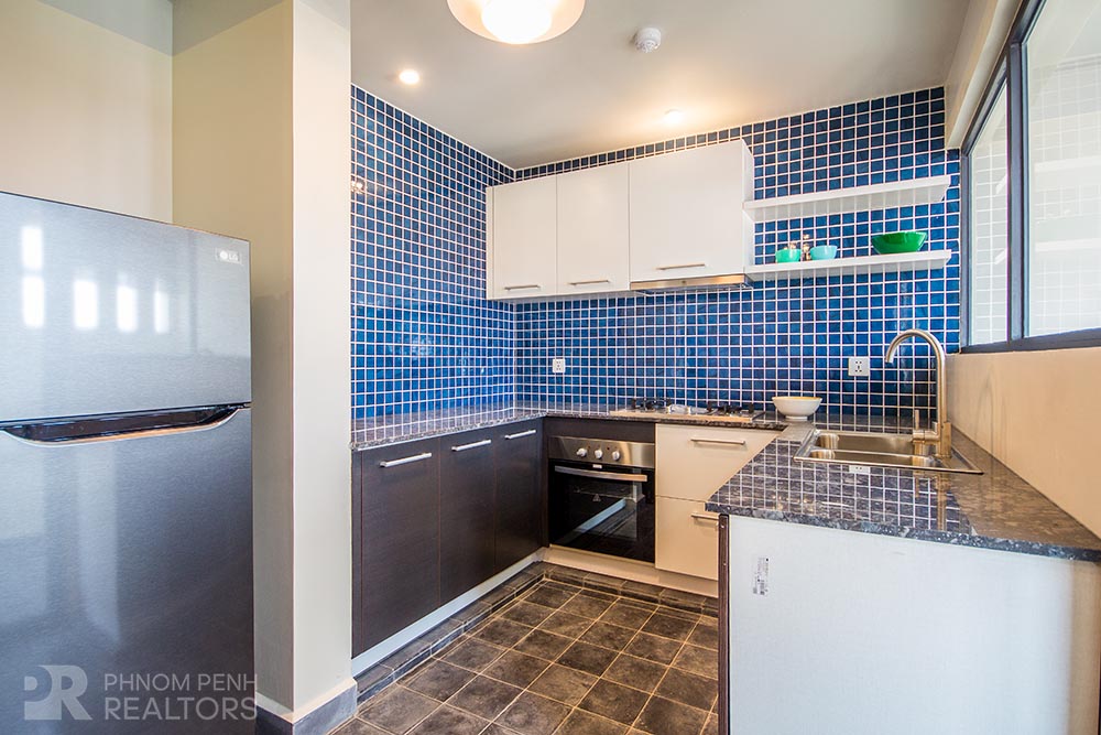 This apartment located in Doun Penh area has 1 bedroom, 1 bathroom and a lot of natural light. This furnished unit is equipped with fire alarm system, smoke detector, sprinkler system, flat screen TVs, air-con, hot water, oven, washing machine, walk-in closets and a terrace. The unit services included internet, cable TV and cleaning. Building amenities include 24 hours security, elevator, fitness center, swimming pool, garden, parking space for car, moto and bicycle.