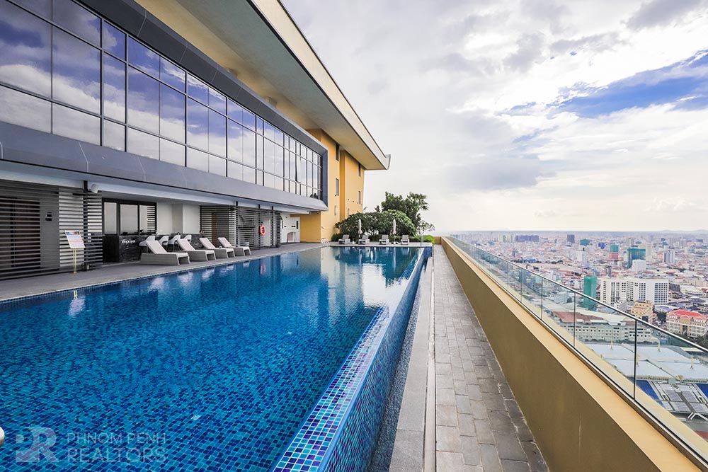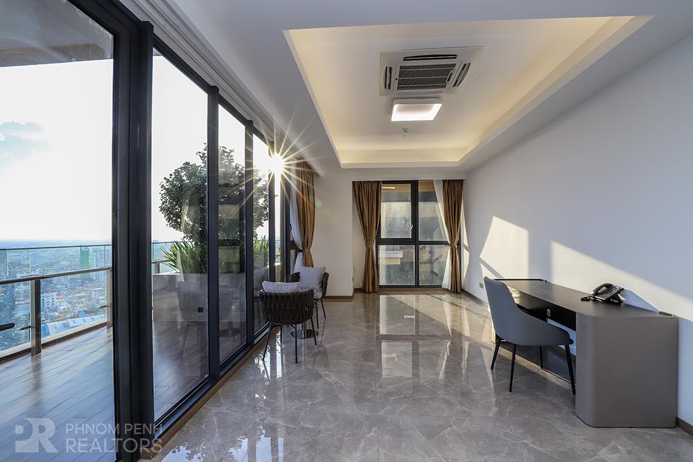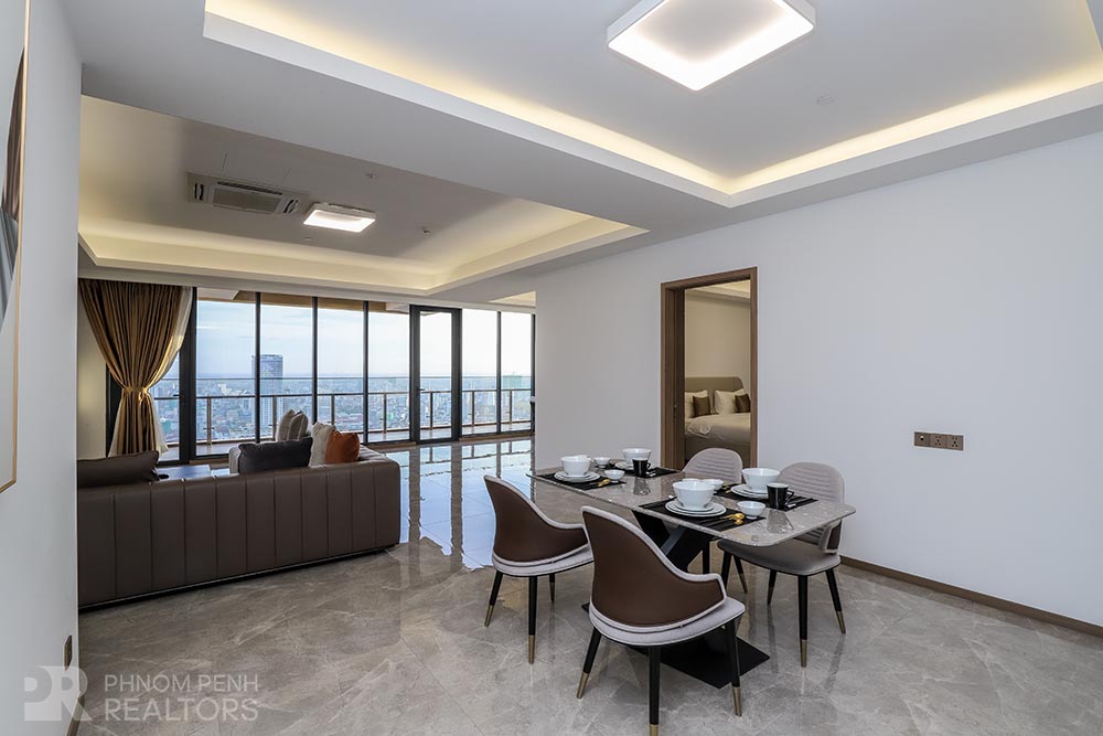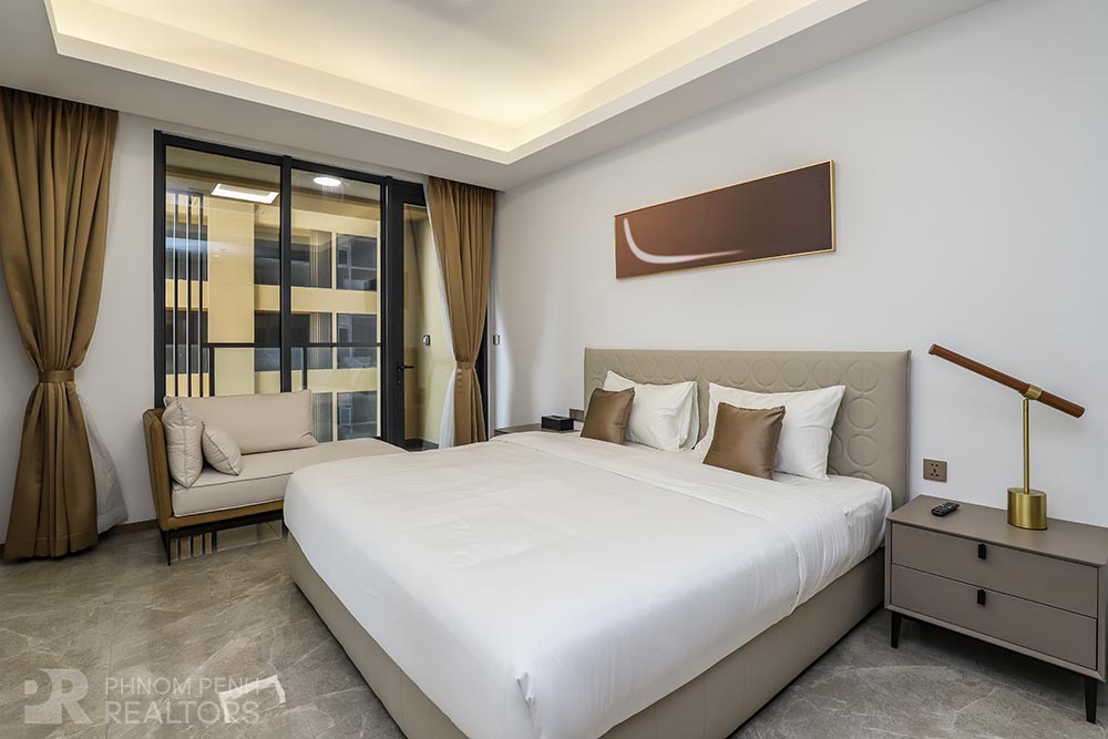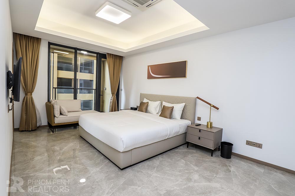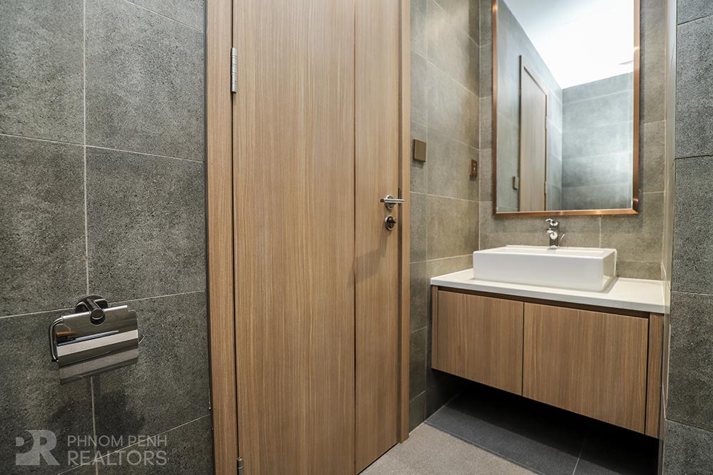 This specious condominium is located in Olympic neighborhood consists 2 bedrooms, 3 bathrooms, 1 storage, a large living room and big balcony full of natural light and show you a really beautiful view of Capital Phnom Penh. This unit designed with built-in closet, separated kitchen and dining area. The living room and some parts of bedrooms designed with glass walls that really let the lights come through the whole unit to make it look very cozy and fresh. This unit provided flat screen TVs, air cons, hot water, microwave, kitchenware, dish washing machine, washing machine plus new and fully furnished to make you easier and just ready to stay. For further convenient, the condominium included the services such as cleaning twice a week, internet, cable TV, propane, generator and garbage collection. The price is already included with management fee and free access to steam, sauna, gym, sky pool, common area, elevator, parking for car, motorbike, bicycle with 24h security at all entries.