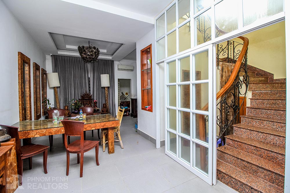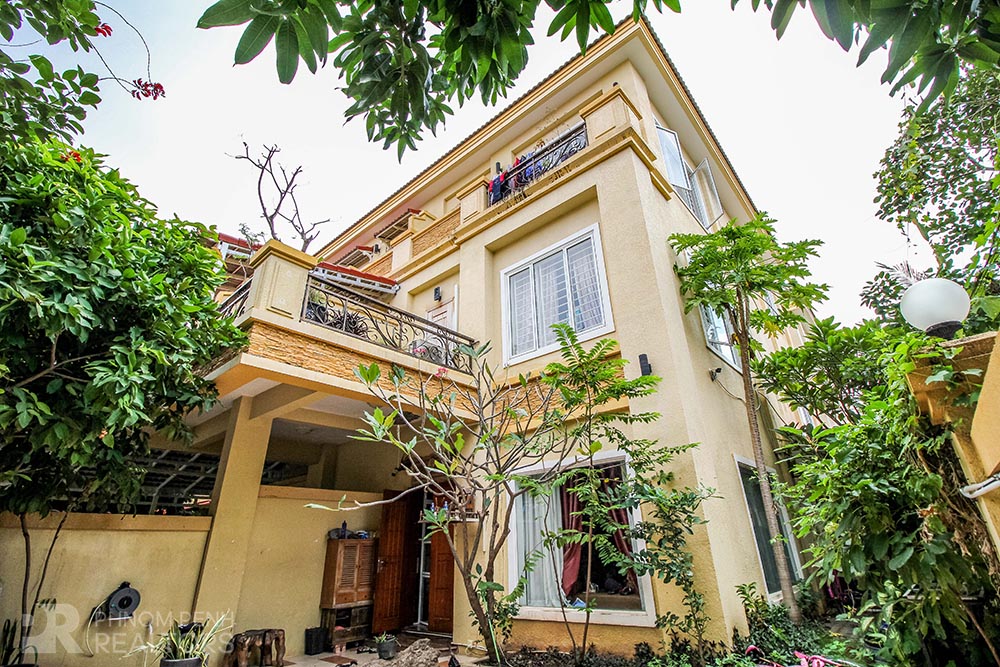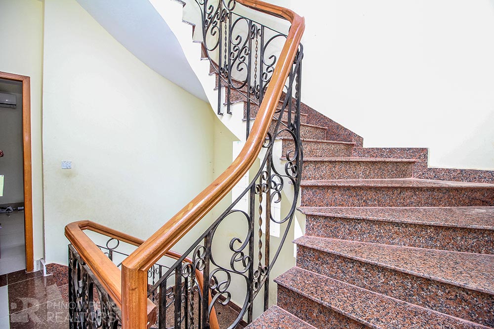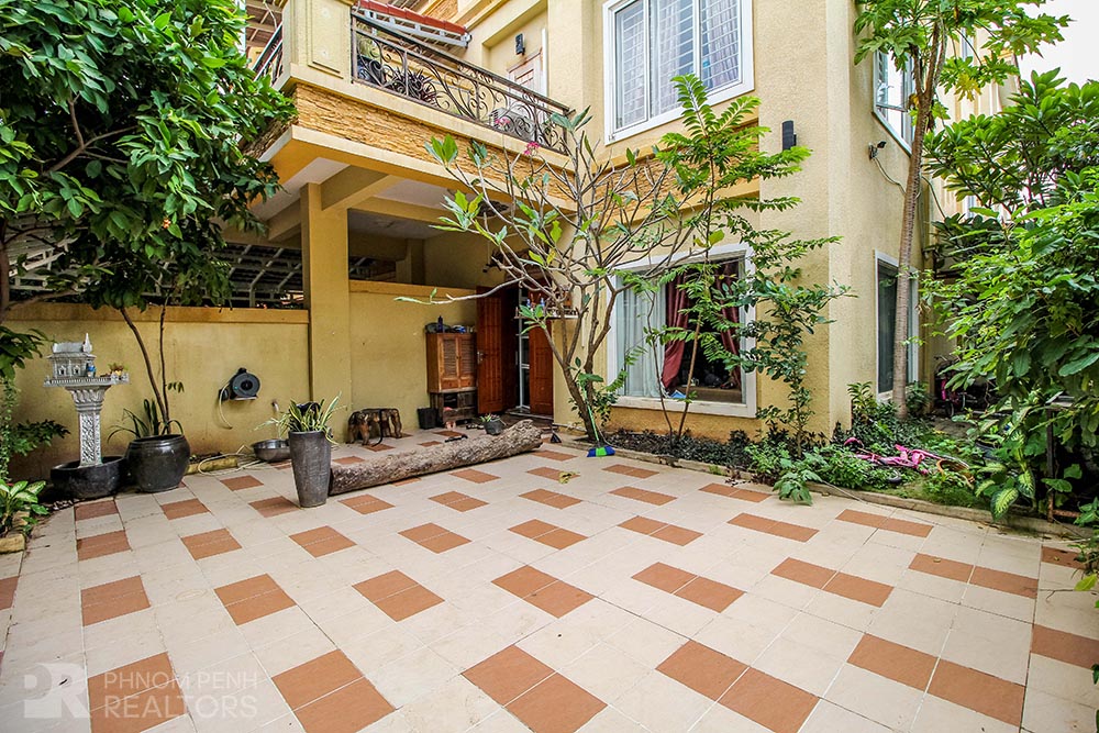This villa is located in Reusey Keo neighborhood has 4 bedrooms, 5 bathrooms and natural light. The unit is equipped with furnishings, hot water, flat screen TVs, terrace, garden, a washing machine and built in closets. Building amenities include internet, cable, propane, garbage collection and parking for car, motorbike and bicycle.