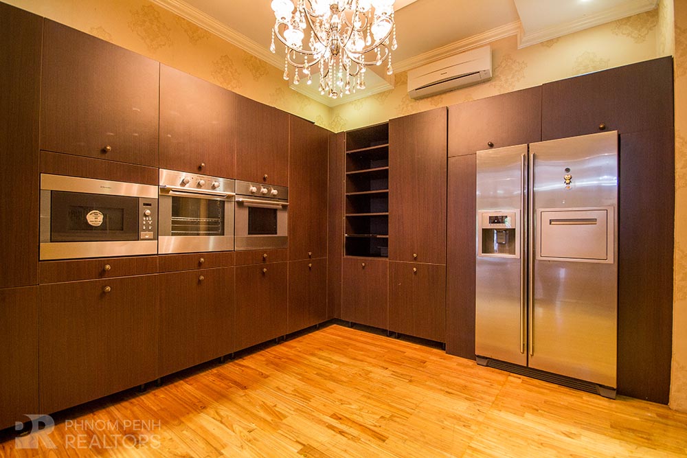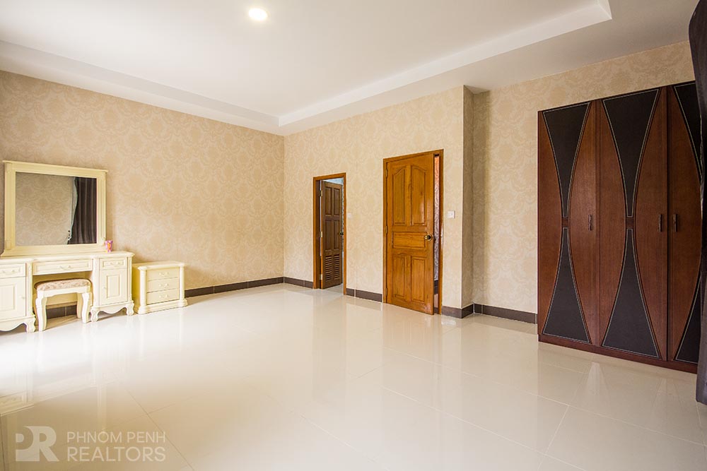This villa is located in Sen Sok area has 4 bedrooms, 5 bathrooms and a lot of natural light. This furnished villa is equipped with modern kitchen, wooden floor, a big balcony, air conditioners, refrigerator, oven and microwave. Villa amenities include with parking for car, motorbike and bicycle.