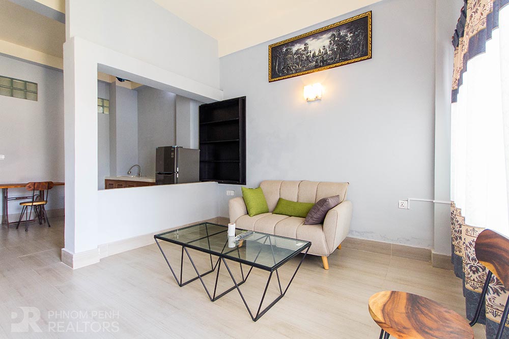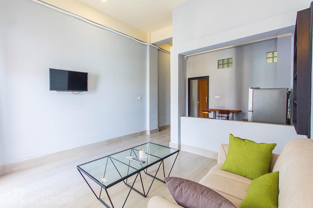 This beautiful apartment with full of natural light is located in Tonle Bassac area has 1 bedroom, 1 bathroom and a balcony. This furnished unit is equipped with a flat screen TV, air-cons, refrigerator, hot water, washing machine and closets. This unit service includes with Internet, cable TV and cleaning 2 times per week. This building amenity includes with parking space for car, motorcycle and bicycle.