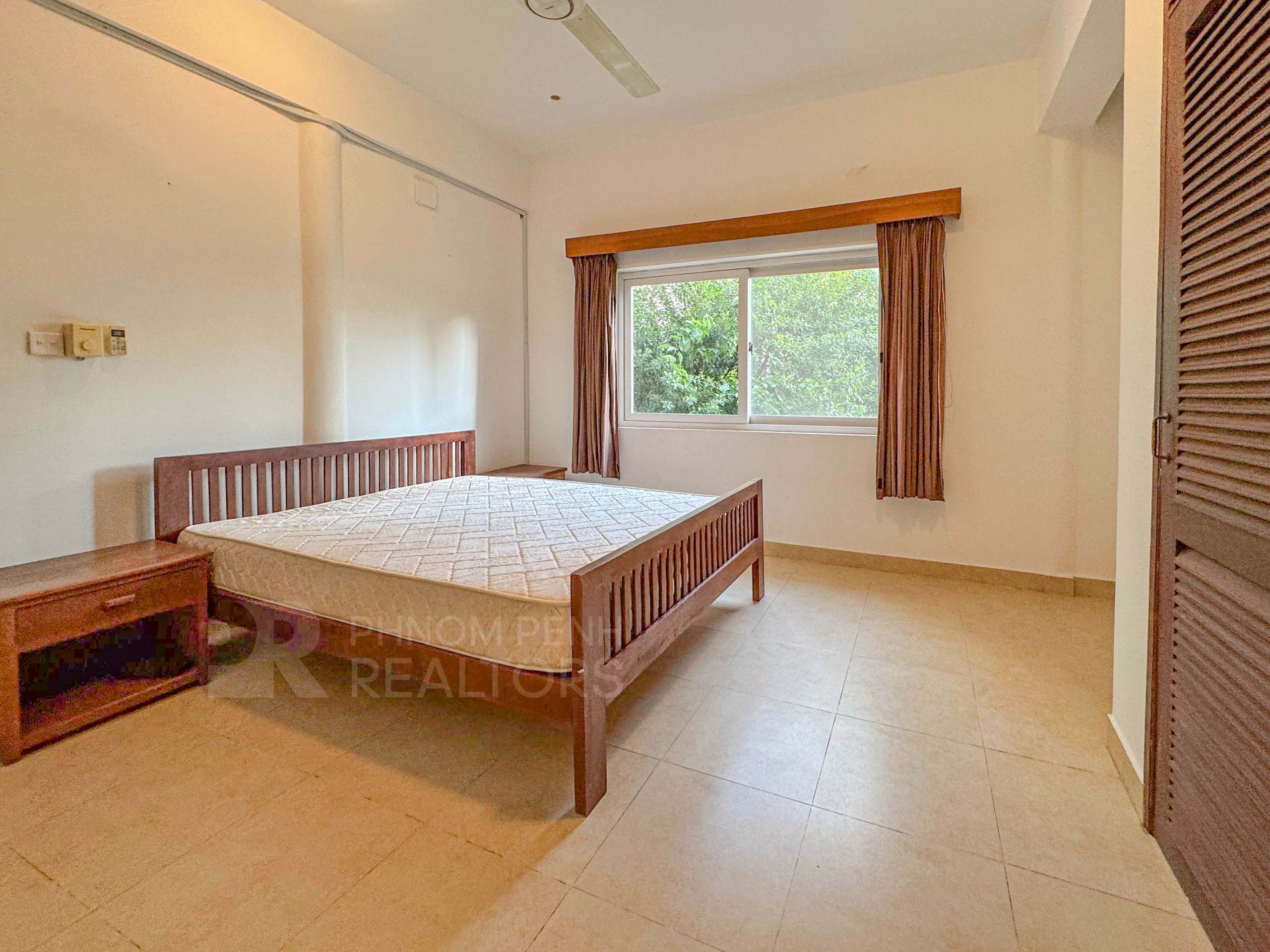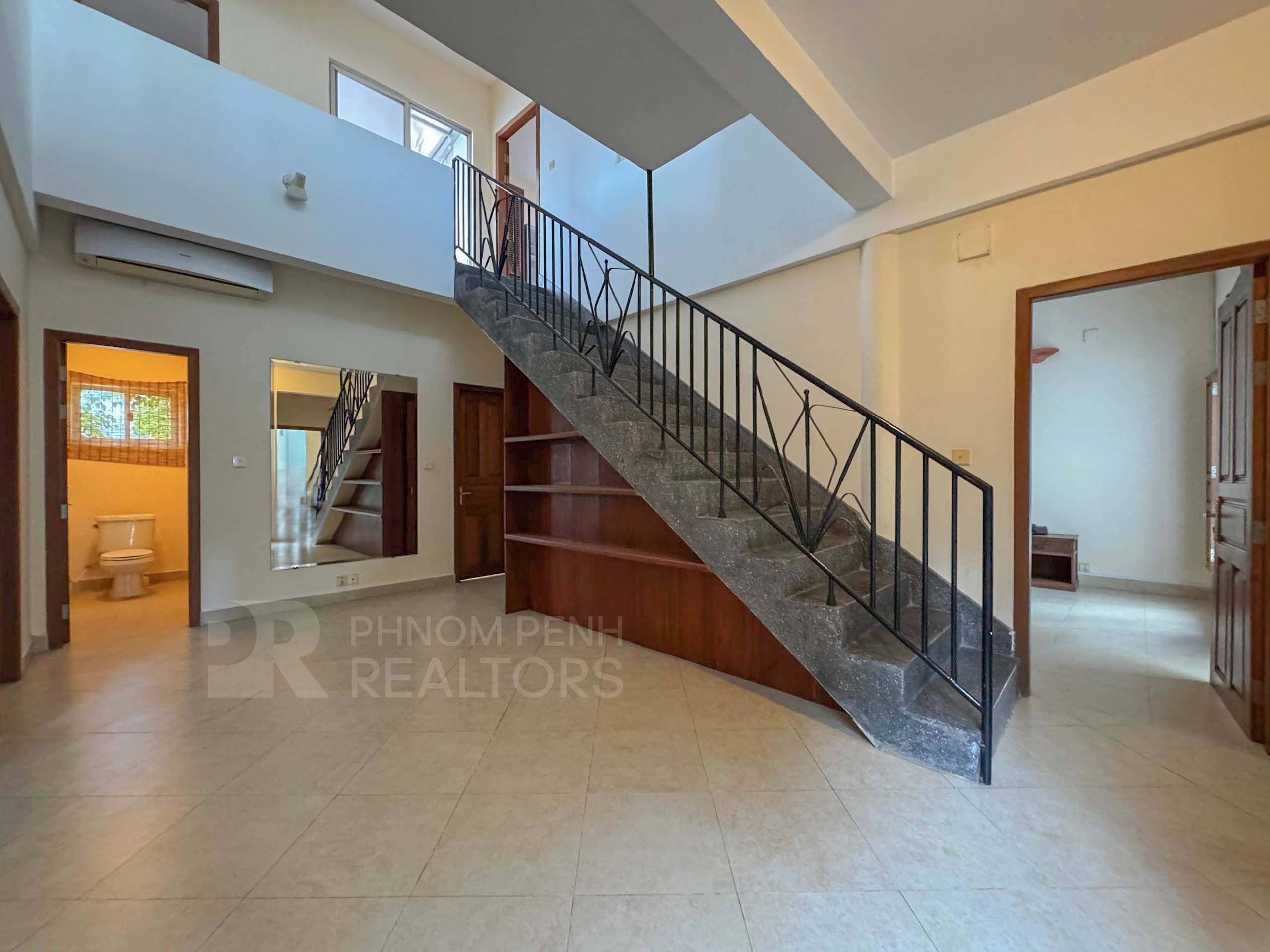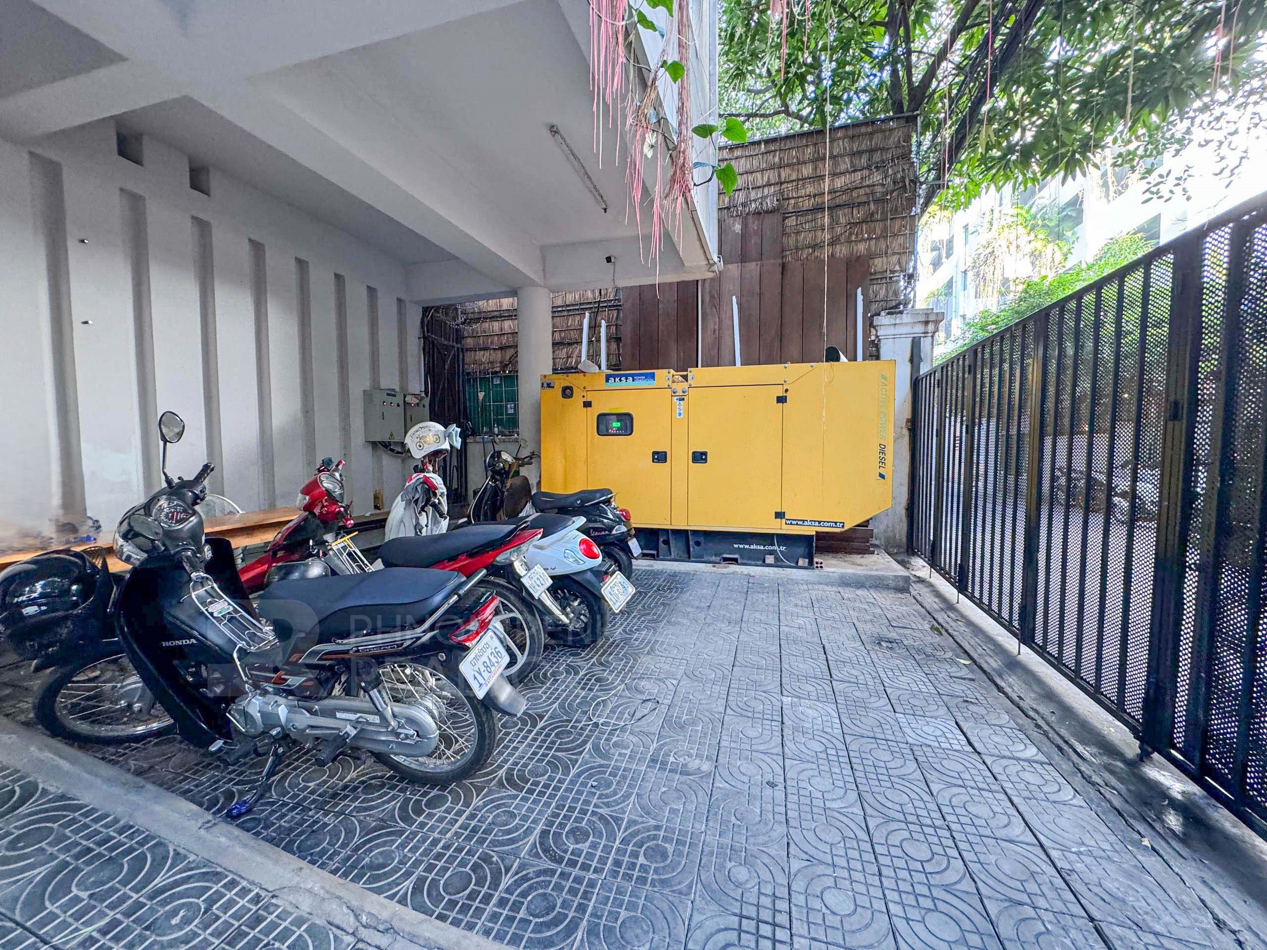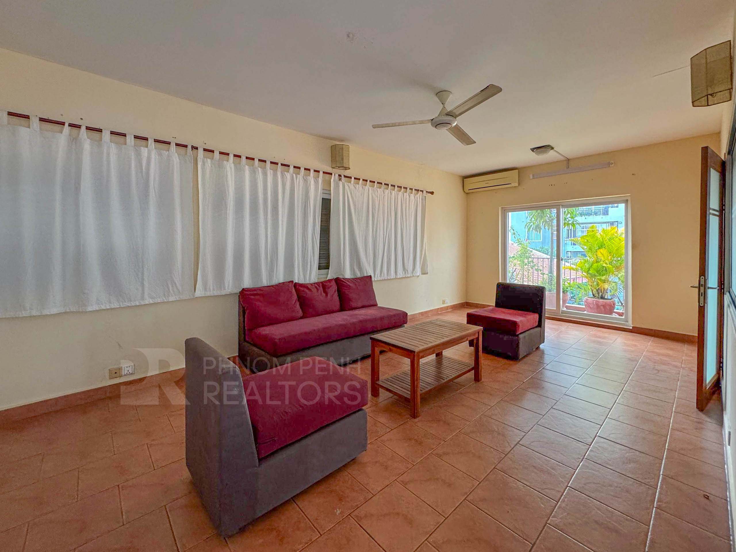 This duplex apartment is located in Tonle Bassac area has 3 bedrooms, 3 bathrooms, 1 storage room and a lot of natural light. This furnished unit is equipped with a flat screen TV, air-cons, hot water, oven, a washing machine, built-in closets, balcony and terrace. The unit services included internet and cable TV. Building amenities include security, swimming pool, parking for car, motorbike and bicycle.