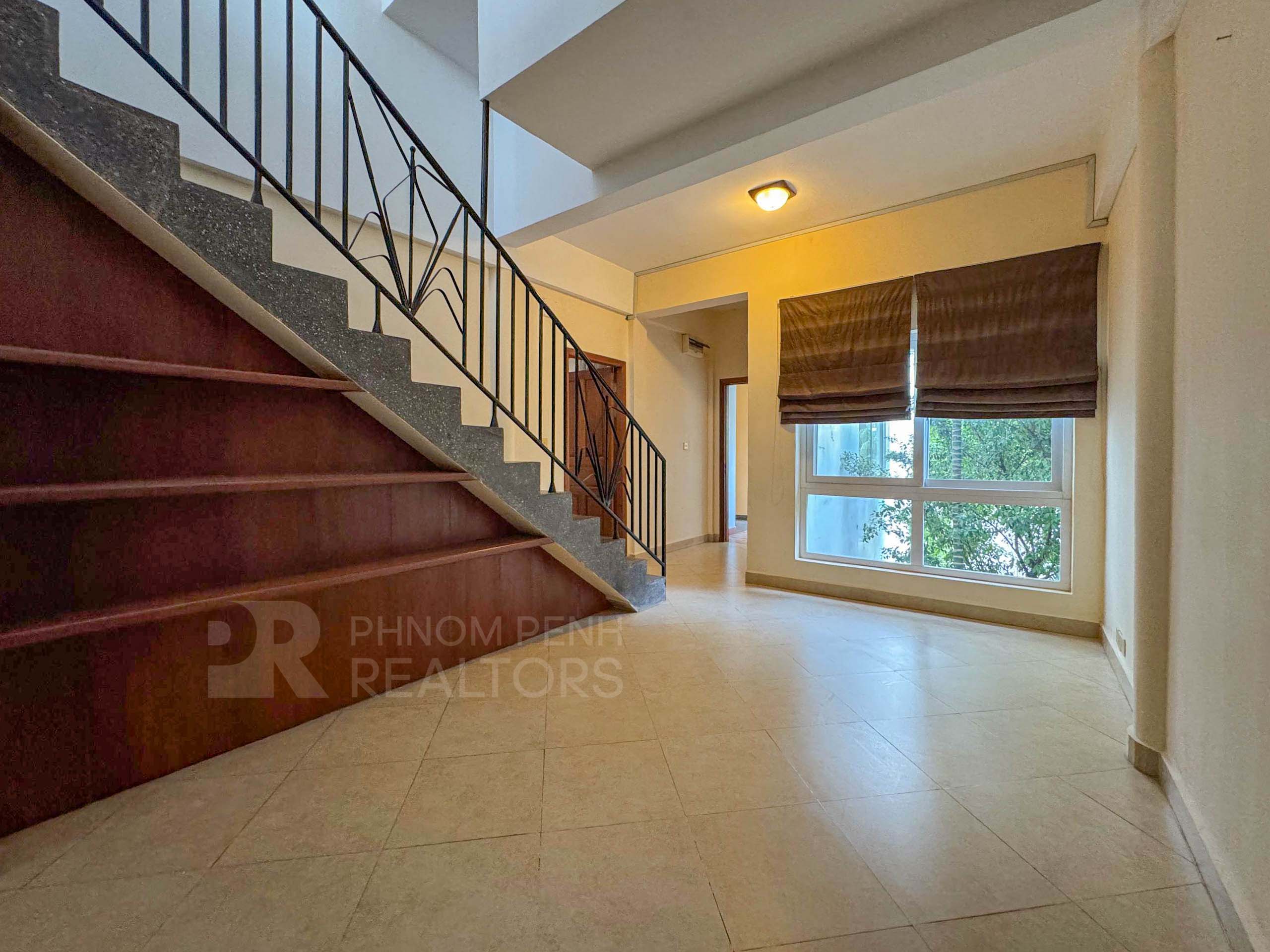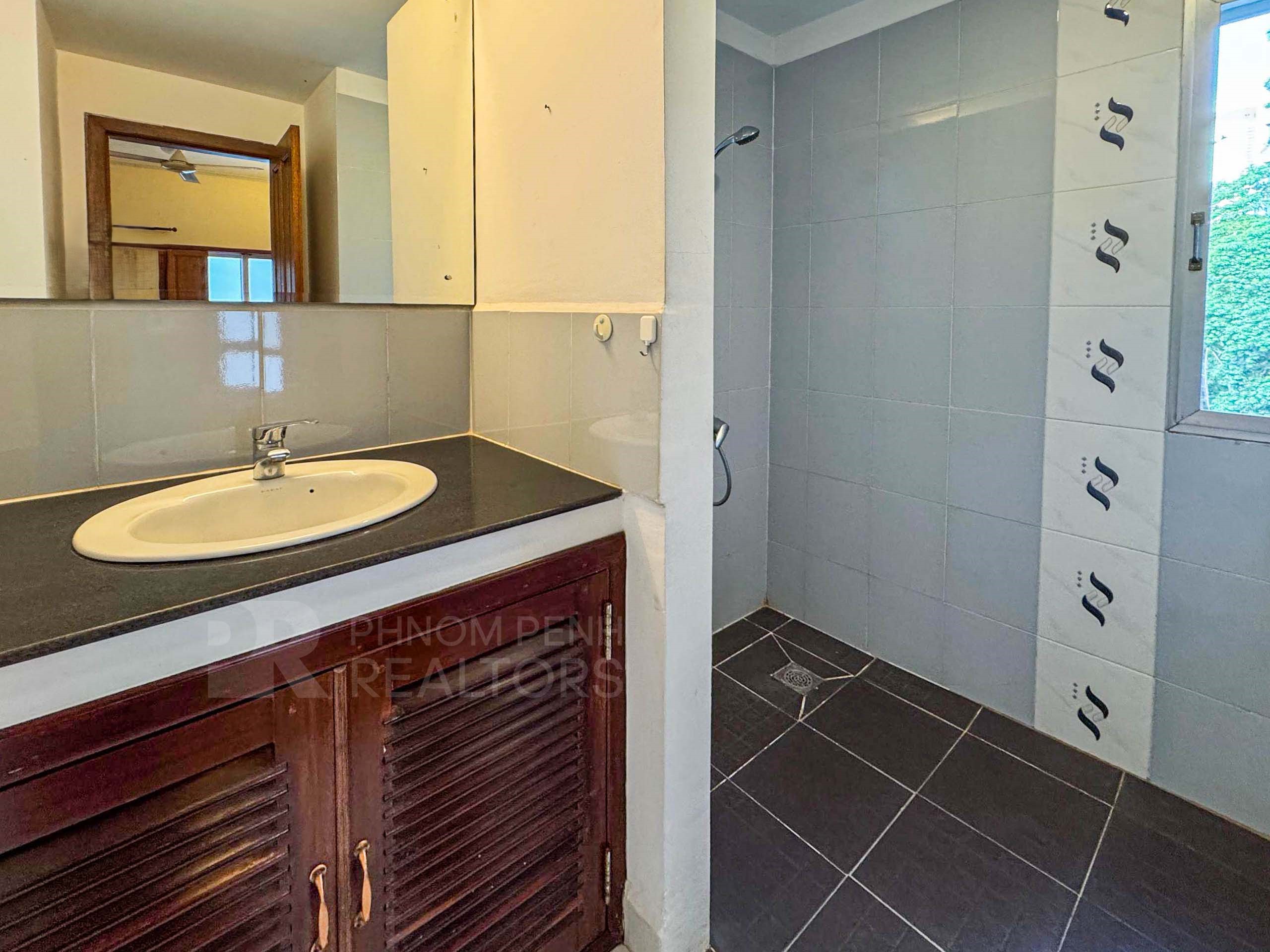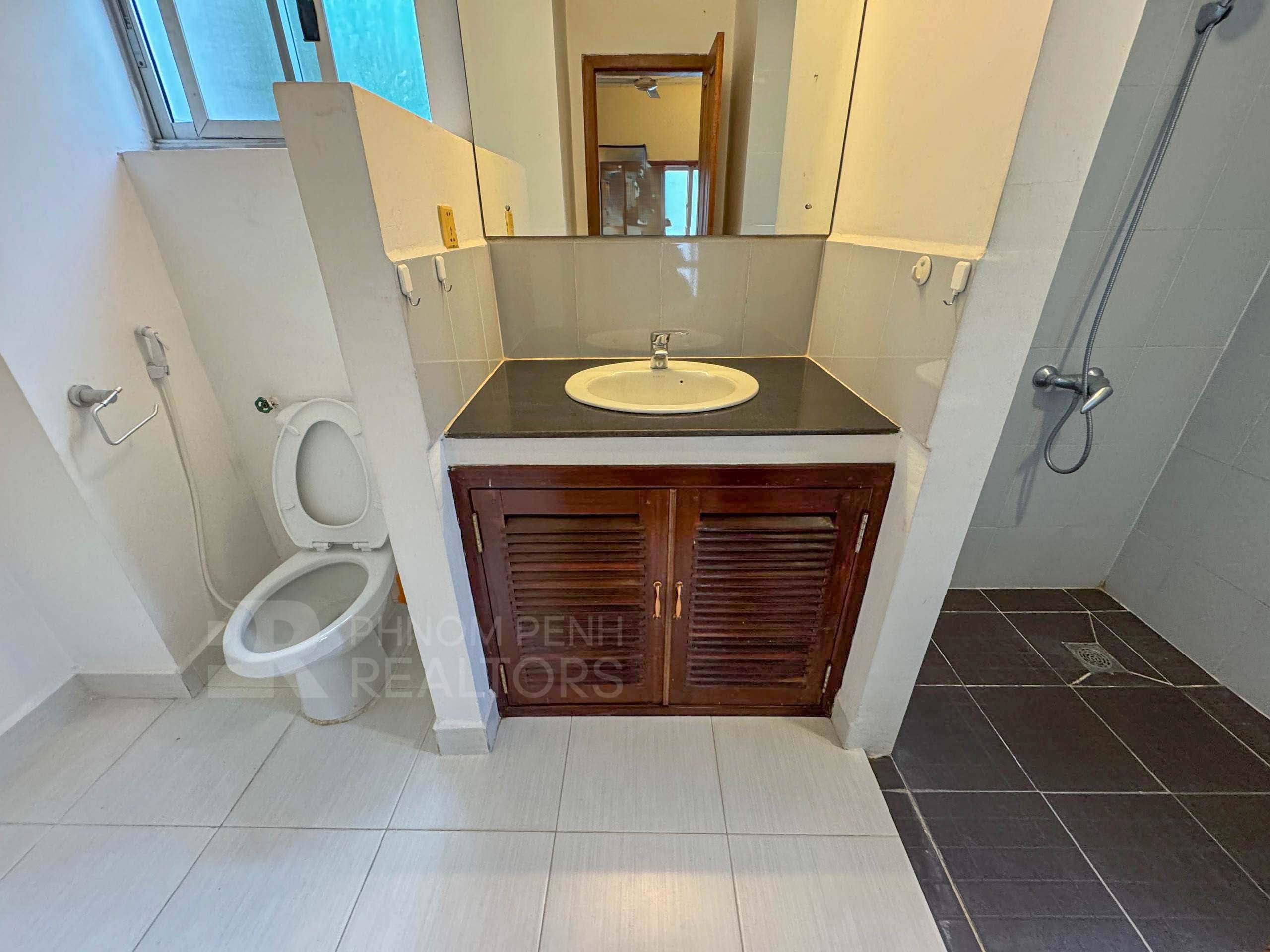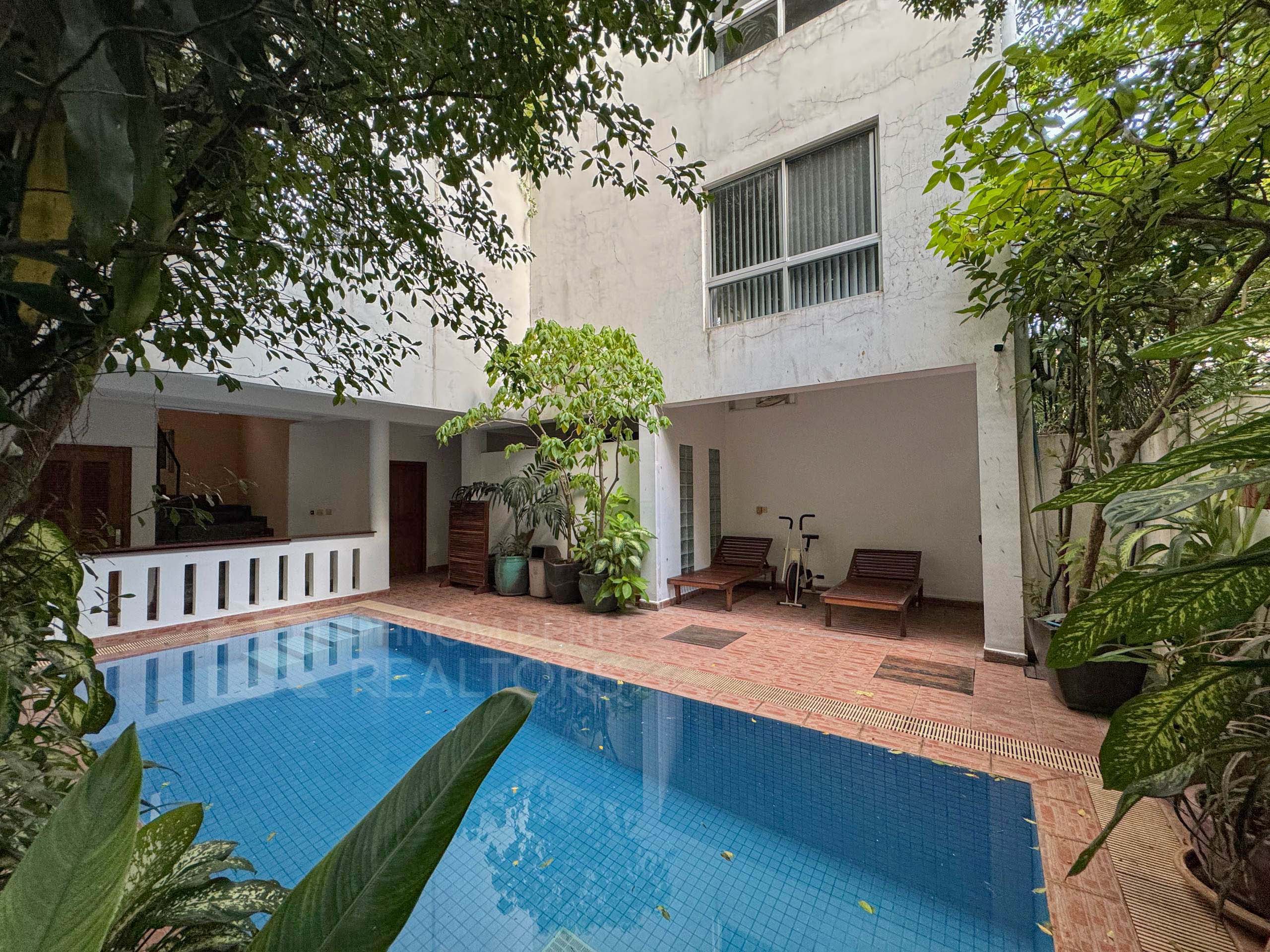 This duplex apartment is located in Tonle Bassac area has 3 bedrooms, 3 bathrooms, 1 storage room and a lot of natural light. This furnished unit is equipped with a flat screen TV, air-cons, hot water, oven, a washing machine, built-in closets, balcony and terrace. The unit services included internet and cable TV. Building amenities include security, swimming pool, parking for car, motorbike and bicycle.