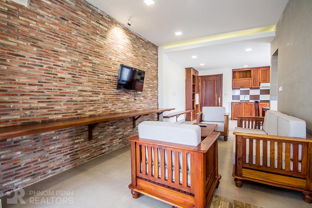 This apartment located in Tonle Bassac area has 1 bedroom, 1 bathroom and a lot of natural light. This furnished unit is equipped with a flat screen TV, air-con, hot water, washing machine, built-in closets and a balcony. The unit services included internet, cable TV, cleaning once a week and water. Building amenities include elevator, parking for car, moto and bicycle.