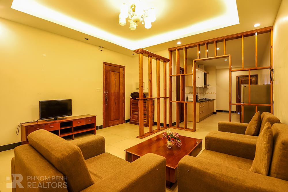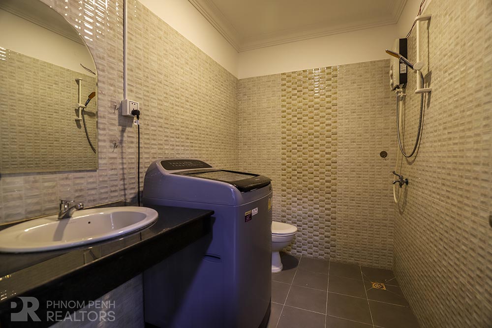 This services apartment located in the Toul Kork neighbourhood has 2 bedrooms, 2 bathrooms, flat screen TV, natural light, city view, and build-in closets. The unit is equipped with in-unit washing machine, a balcony. Building amenities include internet, cable, generator, water, garbage collection, cleaning 2 times per week, and car, moto, and bicycle parking.