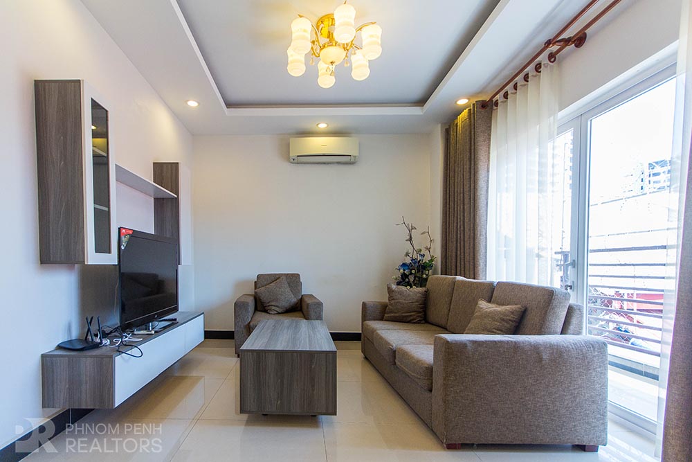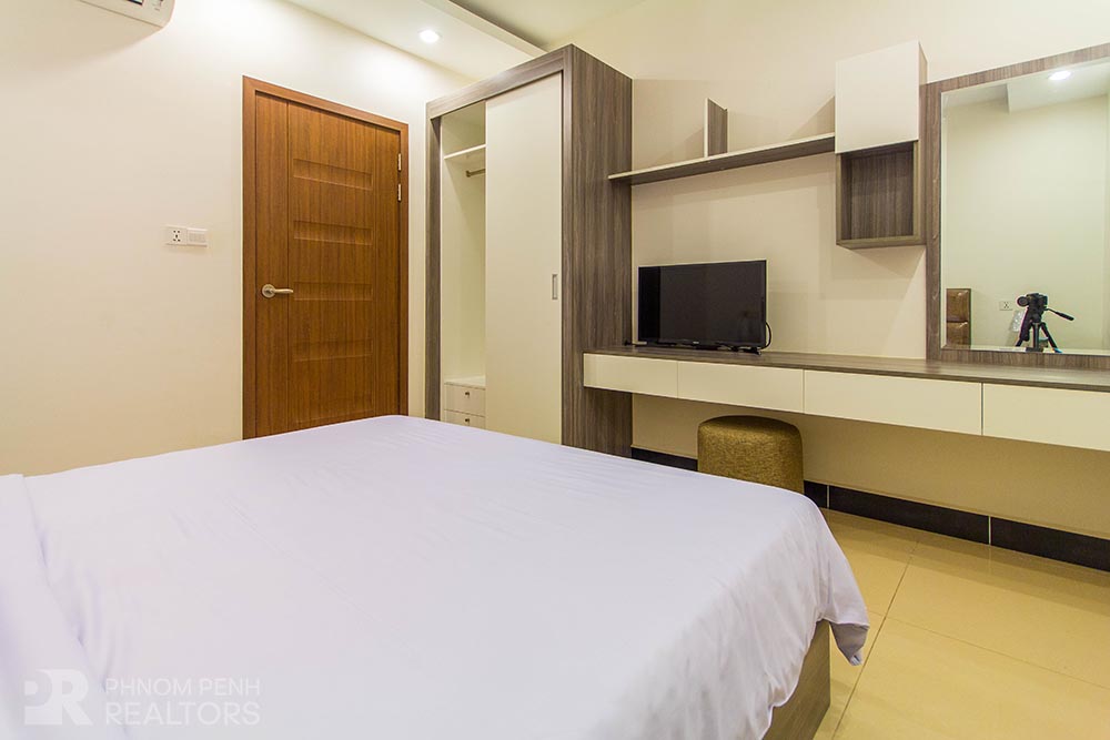 This beautiful apartment is located in the Toul Kork area neighborhood has 3 bedrooms, 2 bathrooms and a lot of natural light. This furnished unit is equipped with flat screen TVs, air-con, refrigerator, hot water, washing machine, built-in closets and a balcony. The unit services included with internet, cable TV and cleaning 2 times per week. Building amenities include with security, elevator and parking space for car, motorbike and bicycle.