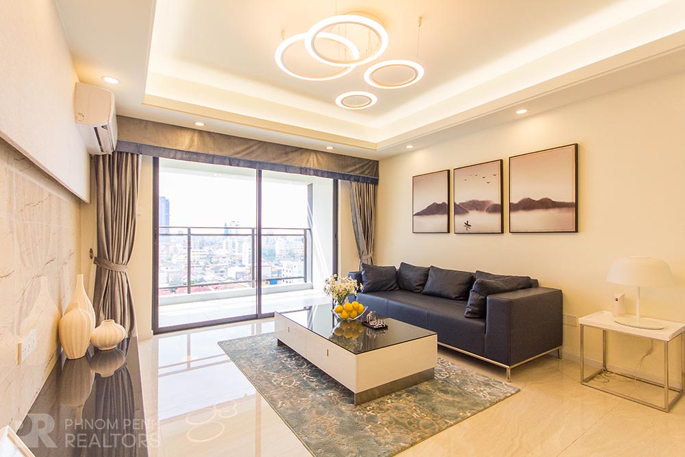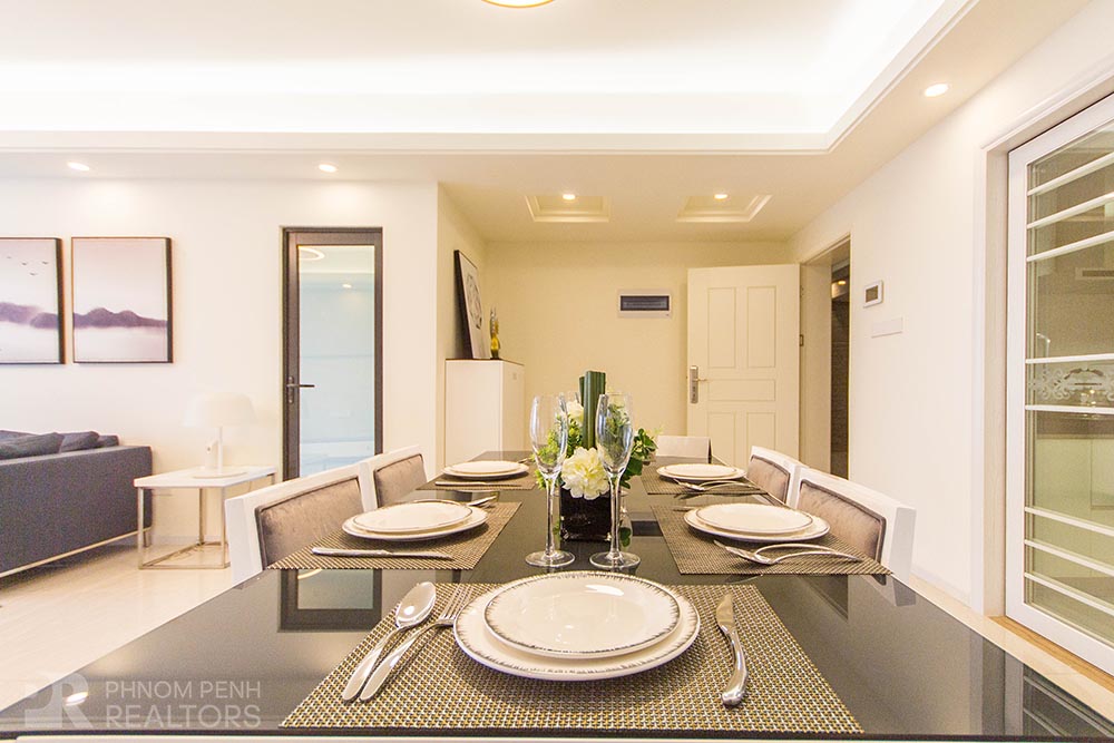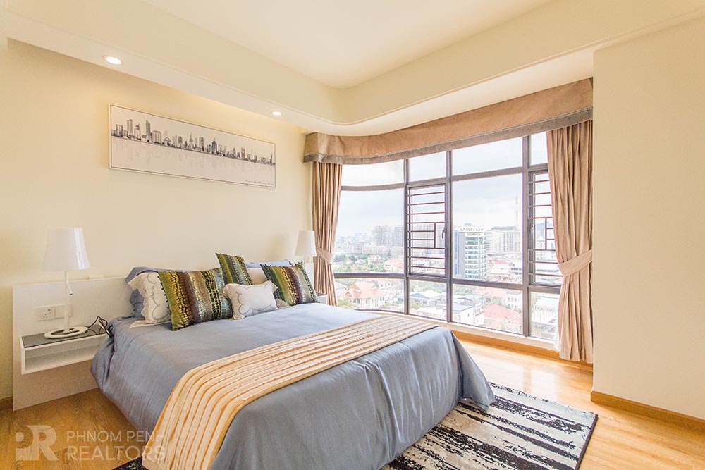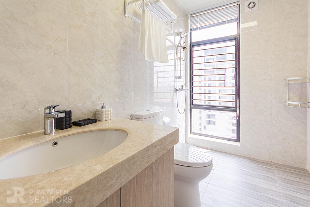 This beautiful condominium is located in Toul Kork neighborhood has 3 bedrooms, 2 bathrooms and a lot of natural light. This fully furnished unit is equipped with air-cons, hot water, washing machine, built-in closets and city view balconies. Building amenities include with security, fitness center, swimming pool, children playground, elevator and parking space for car, motorbike and bicycle.