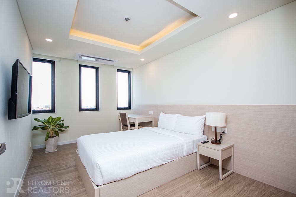 This serviced apartment is located in Toul Kork area has 3 bedrooms, 2 bathrooms and a lot of natural light. This furnished unit is equipped with flat screen TVs, air-cons, hot water, microwave, safety box, washing machine, built-in closets and balconies. The unit services included internet, cable TV, laundry 160pcs/month, cleaning 5 times a week, water supply, garbage collection. Building amenities include receptionist with security 24 hours, fitness center, mini mart, café, kid’s room, theater room, library, BBQ space, parking for car, motorbike and bicycle.