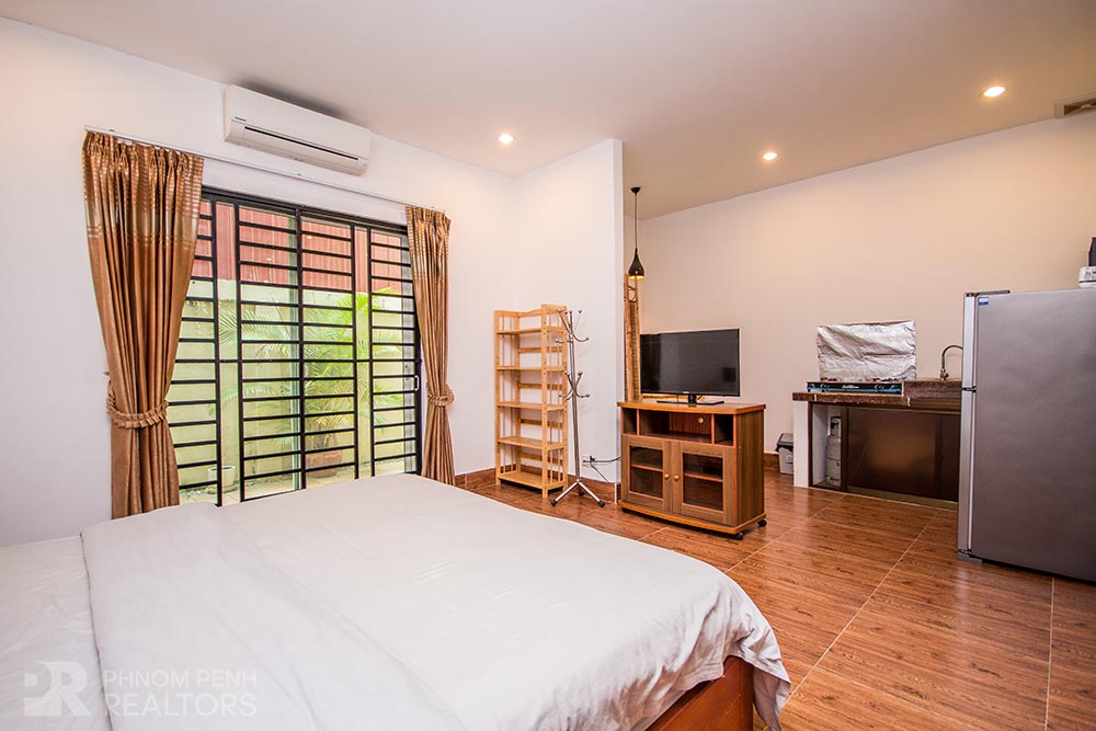 This apartment is located in Toul Kork neighborhood has 1 bedroom, 1 bathroom and natural light. The unit is equipped with new furnishings, a terrace, a built-in closet and a flat screen TV. Building amenities include internet, cable, garbage collection, cleaning once a week, security, parking for car, motorbike and bicycle.