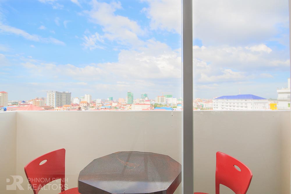 This new apartment is located in Tuol Kork has 1 bedroom, 1 bathroom, built-in closets, new furnishings and a balcony with the lovely view over the city. This unit is equipped with air conditioners, hot water and a washing machine. Building includes security service, elevator and parking. Services include internet, cable-TV, cleaning once a week and parking for a car, motorbike or a bicycle.